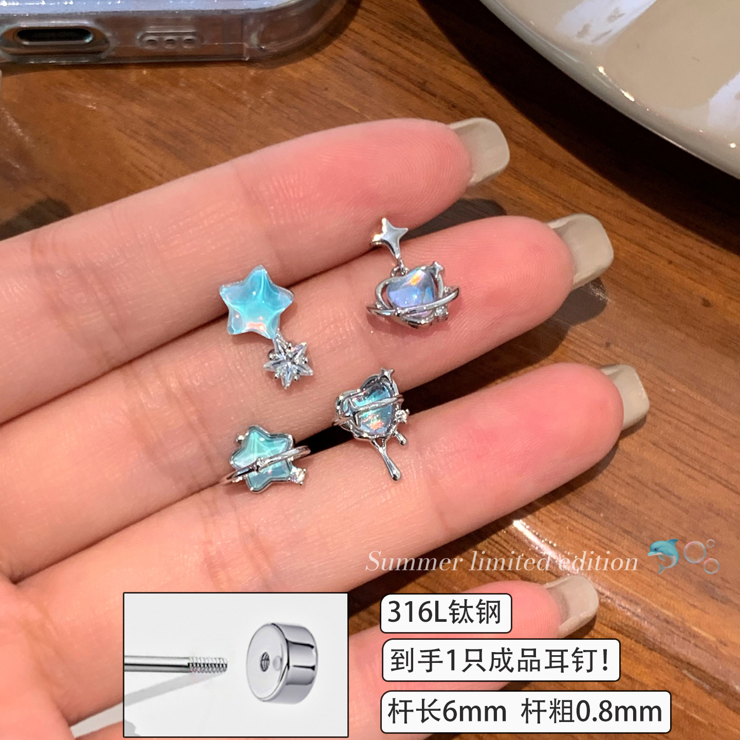 316L钛钢蓝色极光耳饰五角星吊坠锆石耳钉耳骨钉睡觉养耳