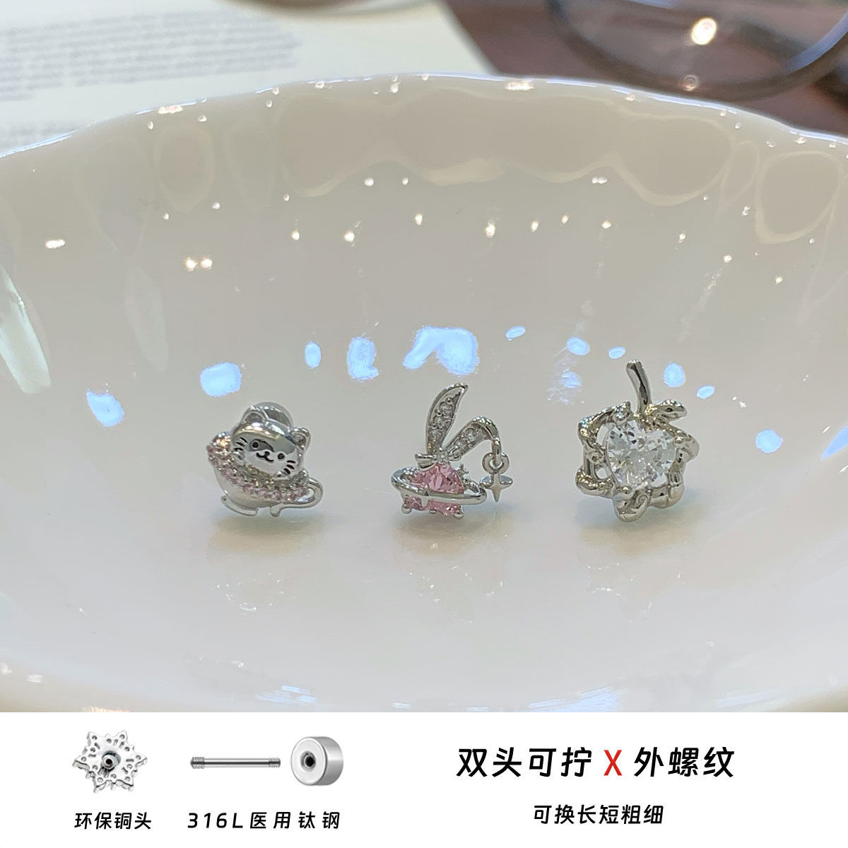 316L医用钛钢耳饰甜酷猫咪锆石耳钉兔子星环耳骨钉高级感苹果耳钉