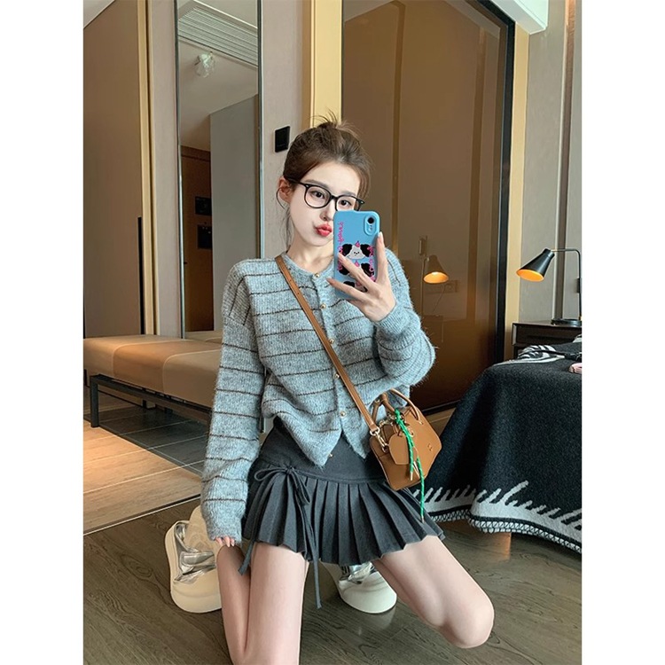 2025秋季新款百搭针织衫短外套女宽松条纹毛衣外套外穿