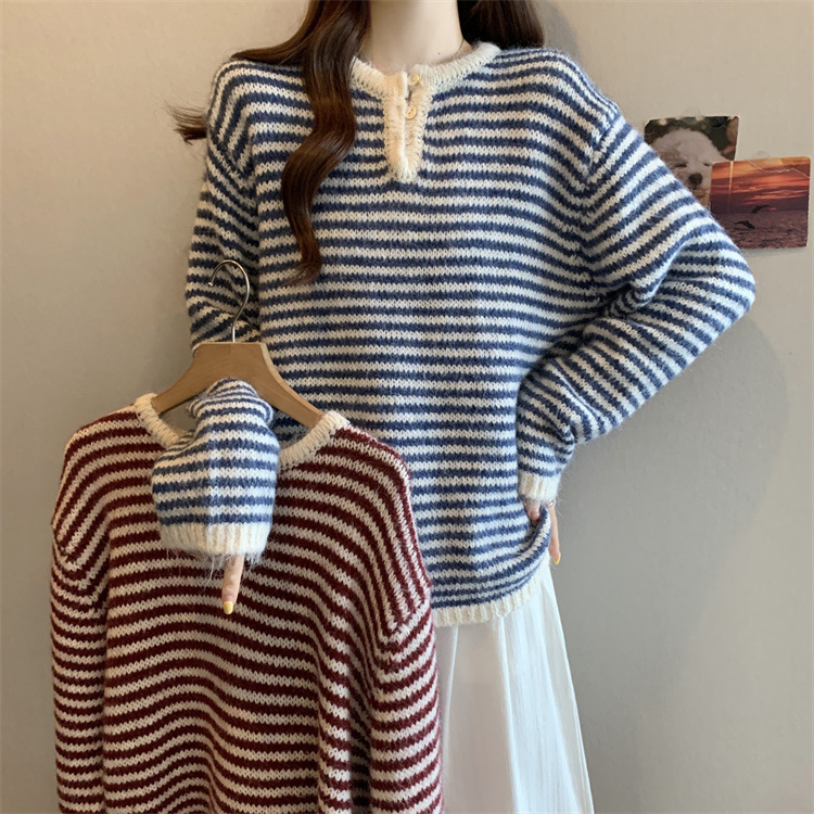 韩系复古条纹高级感针织毛衣女2025秋冬新款时髦百搭长袖套头上衣