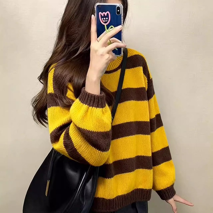 撞色条纹毛衣女秋冬2025新款韩系慵懒风圆领套头针织衫百搭上衣女