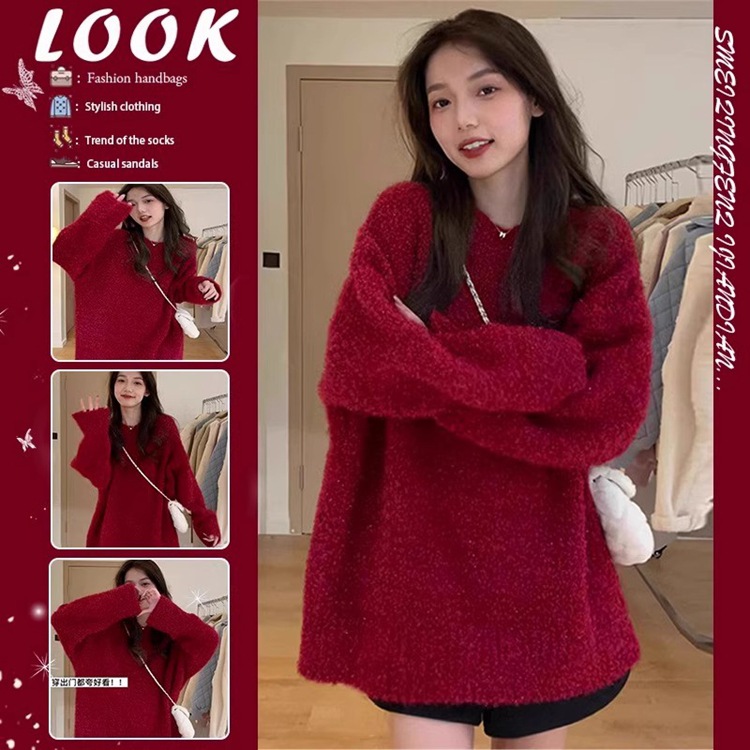 车厘子复古红色毛衣女2025春秋新款慵懒风宽松显瘦套头外穿针织衫