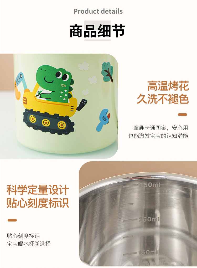 316不锈钢儿童水杯食品级幼儿园牛奶卡通恐龙带盖刻度家用马克杯