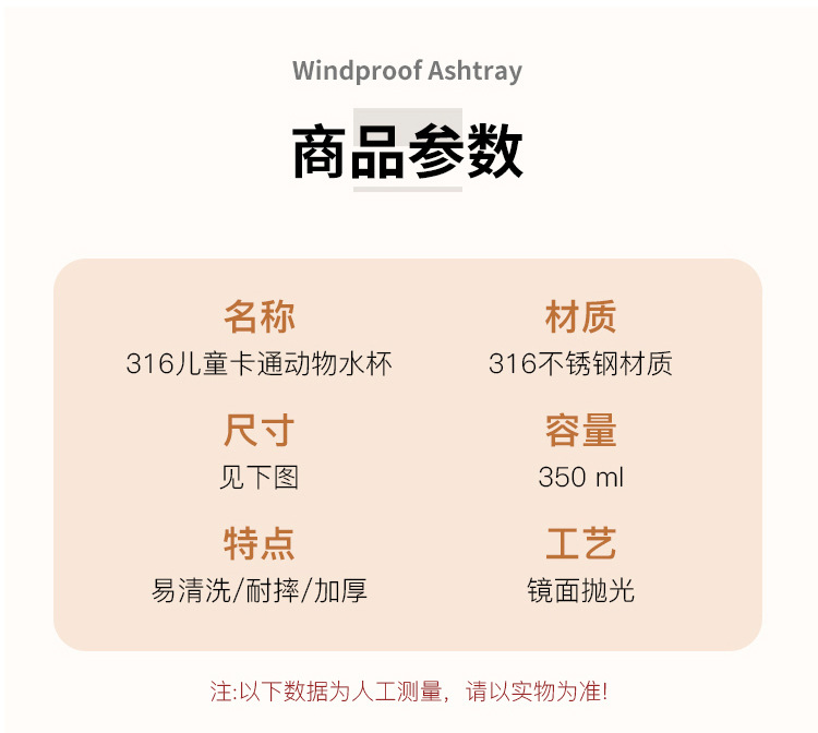 颜色 316L绿恐龙+带盖刻度350ml,316L粉兔子+带盖刻度350ml,316L米色熊猫+带盖刻度350ml,316L绿恐龙+无盖刻度350ml,316L粉兔子+无盖刻度350ml,316L米色熊猫+无盖刻度350ml