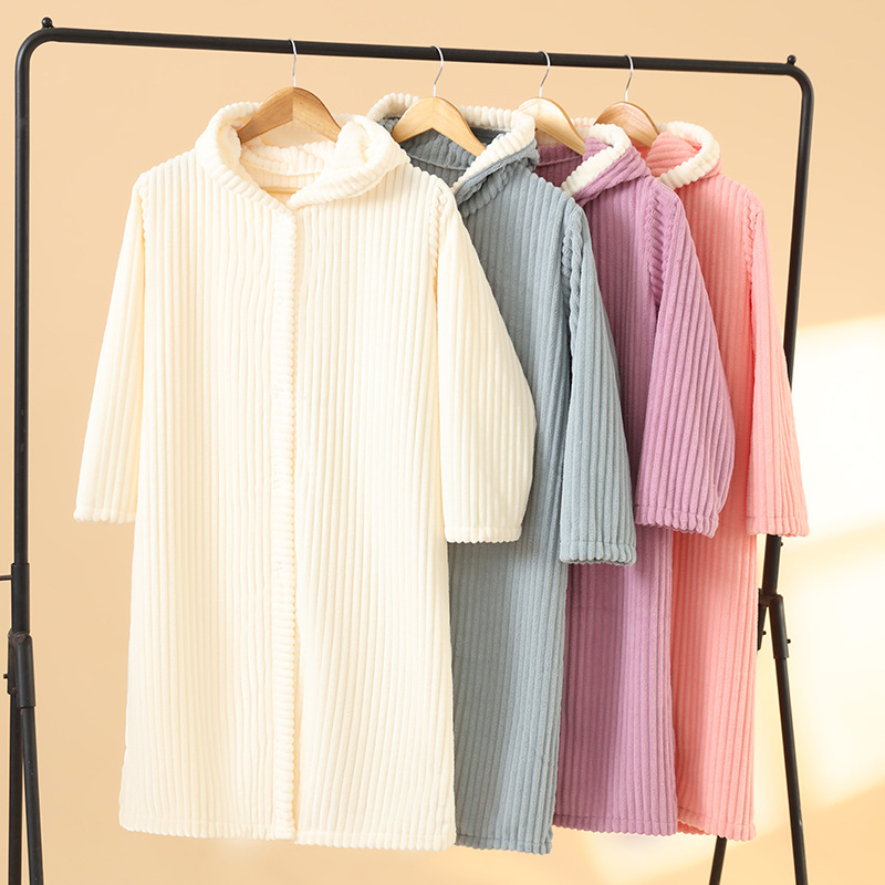 亚马逊同款秋冬拉链浴袍连帽睡袍情侣加厚睡衣法兰绒女士长款睡裙
