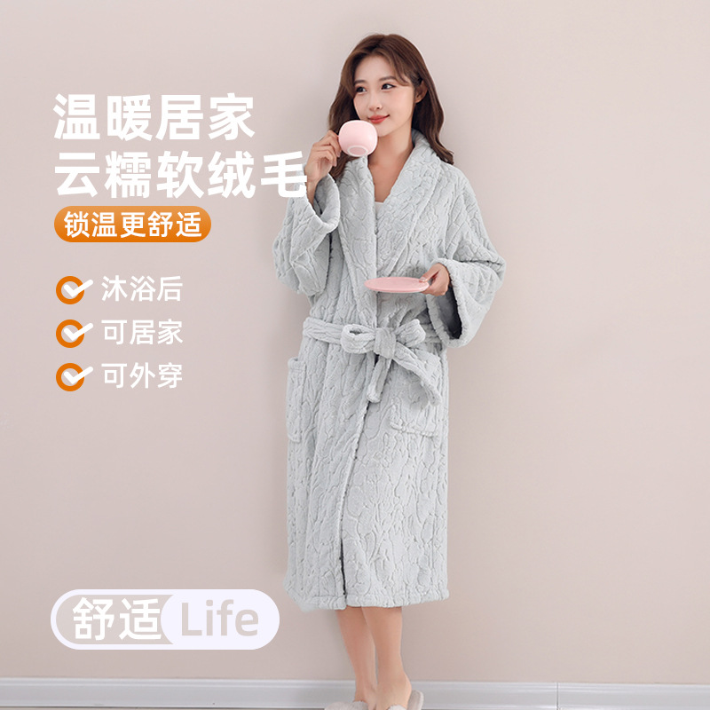 泡泡绒戴帽浴袍女柔软吸水浴衣家用加厚情侣睡衣春秋珊瑚绒浴裙