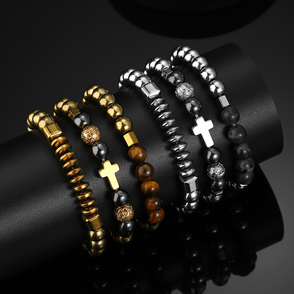 Amazon クロスボーダーメタリックブラック胆石ブレスレットメンズシンプルクロス多層弾性タイガーストーンビーズブレスレット