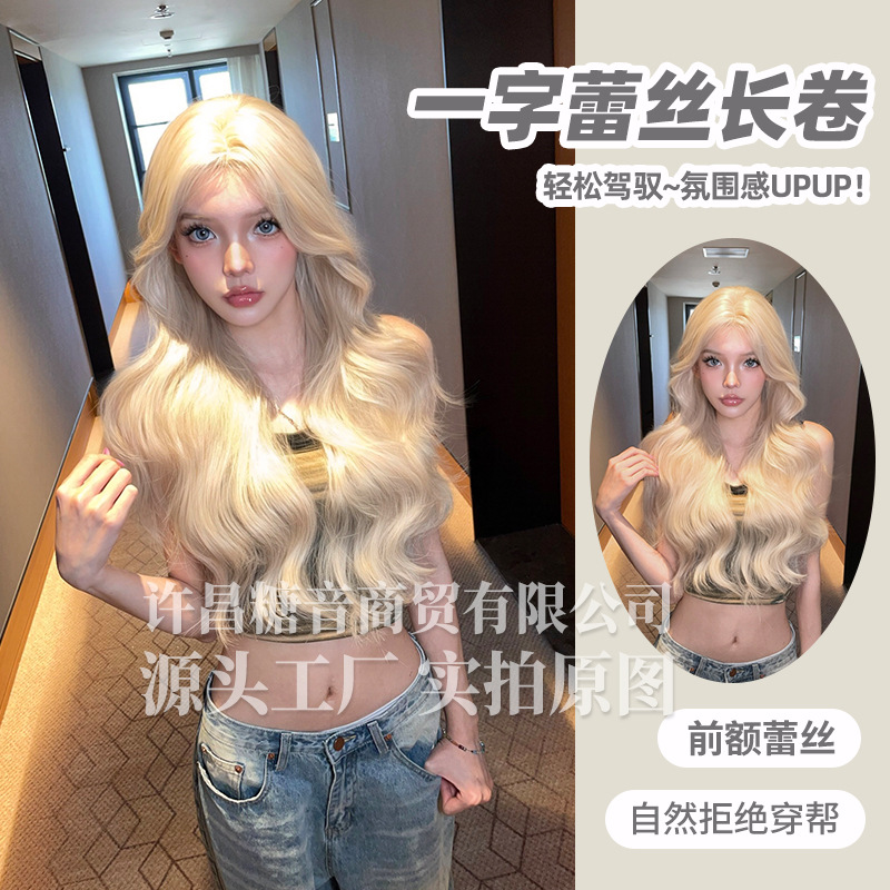 シュガートーンかつら女性ロングヘアクリーム金大きな波长いカールかつら一字レース长いかつら