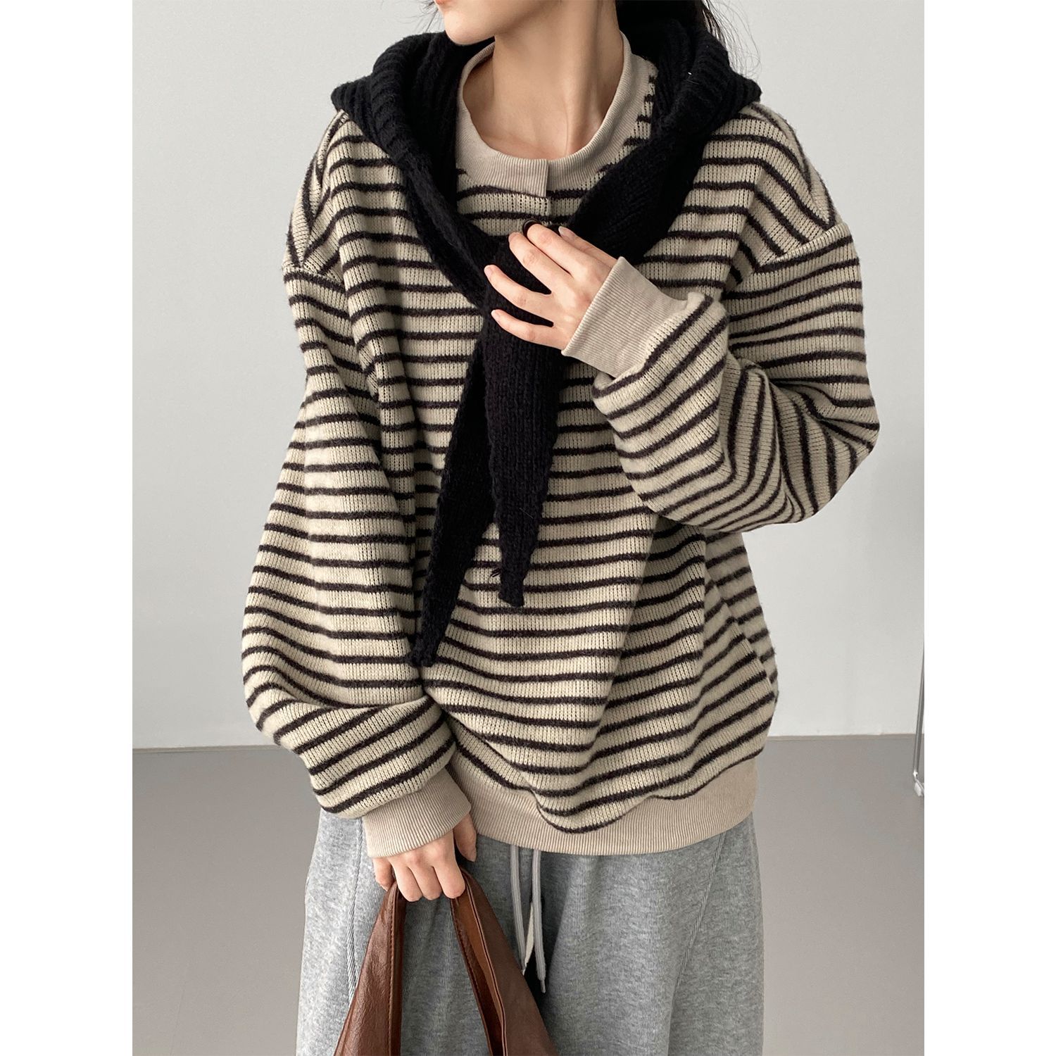 那末 百搭好穿~宽松慵懒风加绒条纹卫衣女韩系圆领休闲上衣6173