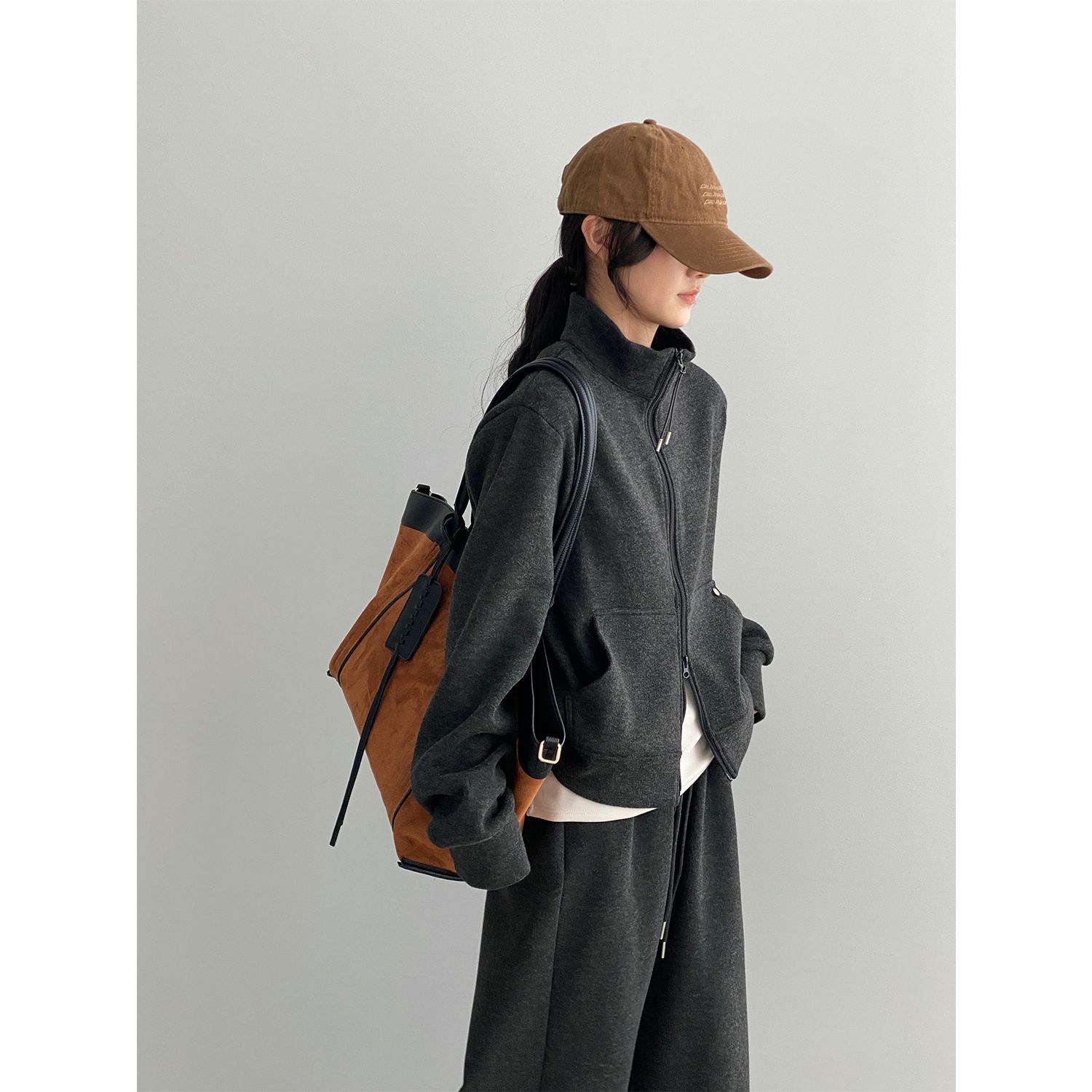 那末 加绒卫衣套装~韩系慵懒风立领外套+松紧腰长裤两件套女E3297