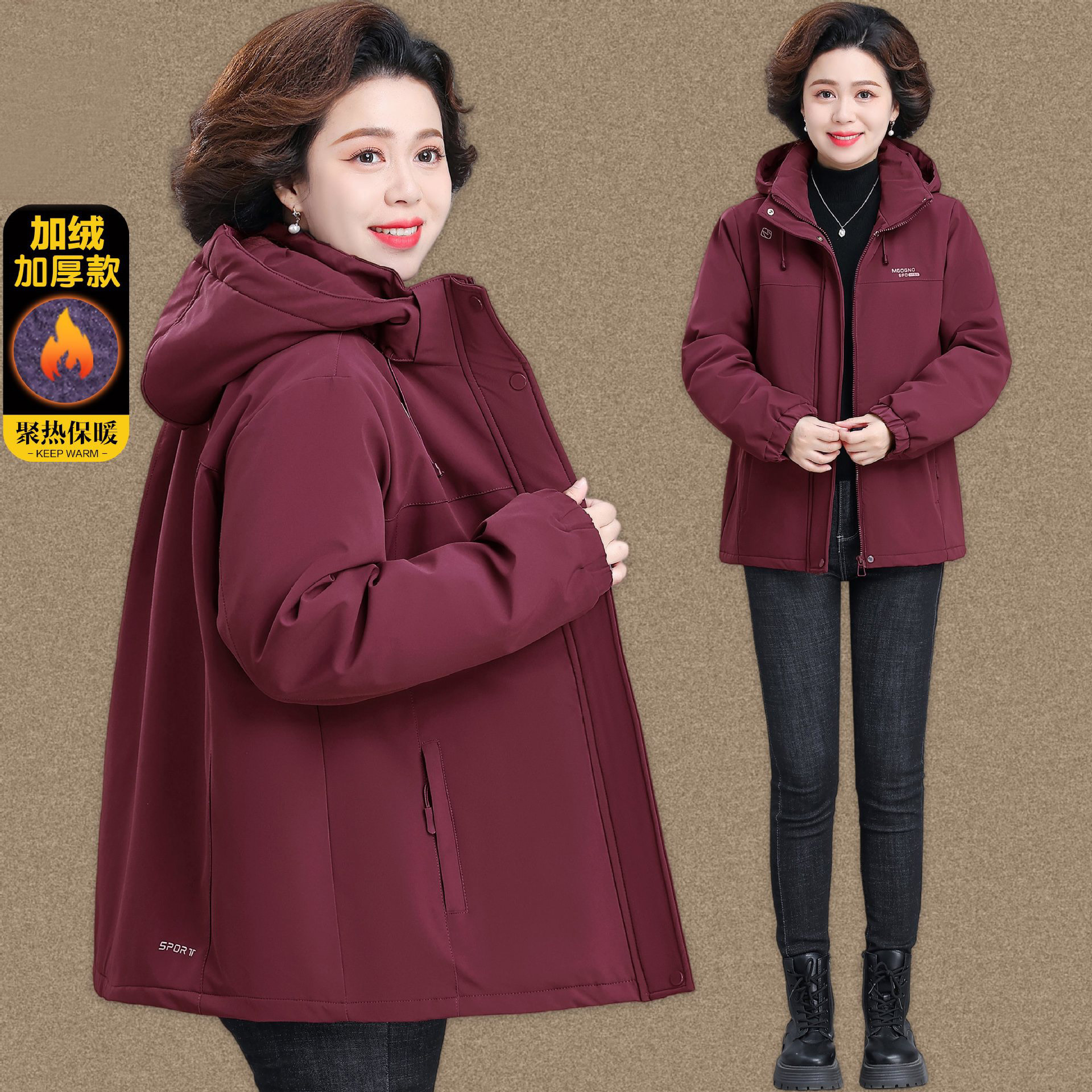 时尚妈妈装加绒加厚连帽红色外套女冬季新款休闲保暖冲锋衣夹克