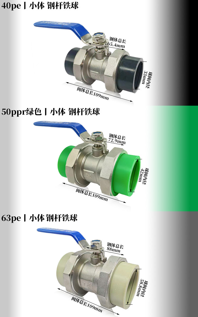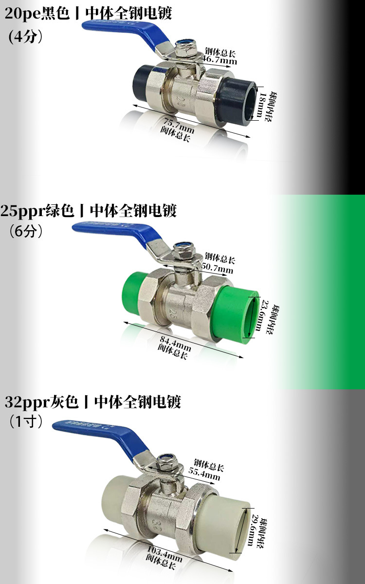 规格型号 不锈钢pe黑色20(4分)活接球阀,不锈钢pe黑色25(6分)活接球阀,不锈钢pe黑色32(1寸)活接球阀,不锈钢pe黑色40(1.2寸)活接球阀,不锈钢pe黑色50(1.5寸)活接球阀,不锈钢pe黑色63(2寸)活接球阀,不锈钢ppr绿色20(4分)活接球阀,不锈钢ppr绿色25(6分)活接球阀,不锈钢ppr绿色32(1寸)活接球阀,不锈钢ppr绿色40(1.2寸)活接球阀,不锈钢ppr绿色50(1.5寸)活接球阀,不锈钢ppr绿色63(2寸)活接球阀,不锈钢ppr灰色20(4分)活接球阀,不锈钢ppr灰色25(6分)活接球阀,不锈钢ppr灰色32(1寸),不锈钢ppr灰色40(1.2寸),不锈钢ppr灰色50(1.5寸),不锈钢ppr灰色63(2寸),不锈钢pe黑色中体全钢电镀20(4分),不锈钢pe黑色中体全钢电镀25(6分),不锈钢pe黑色中体全钢电镀32(1寸),不锈钢ppr绿色中体全钢电镀20(4分),不锈钢ppr绿色中体全钢电镀25(6分),不锈钢ppr绿色中体全钢电镀32(1寸),不锈钢ppr灰色中体全钢电镀20(4分),不锈钢ppr灰色中体全钢电镀25(6分),不锈钢ppr灰色中体全钢电镀32(1寸),Q21F-40P