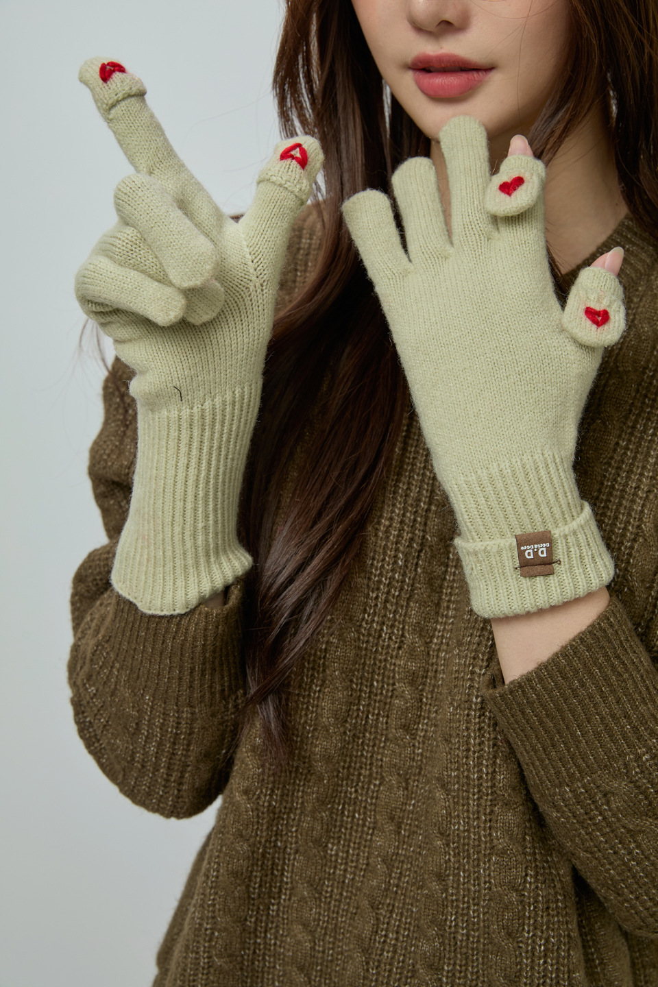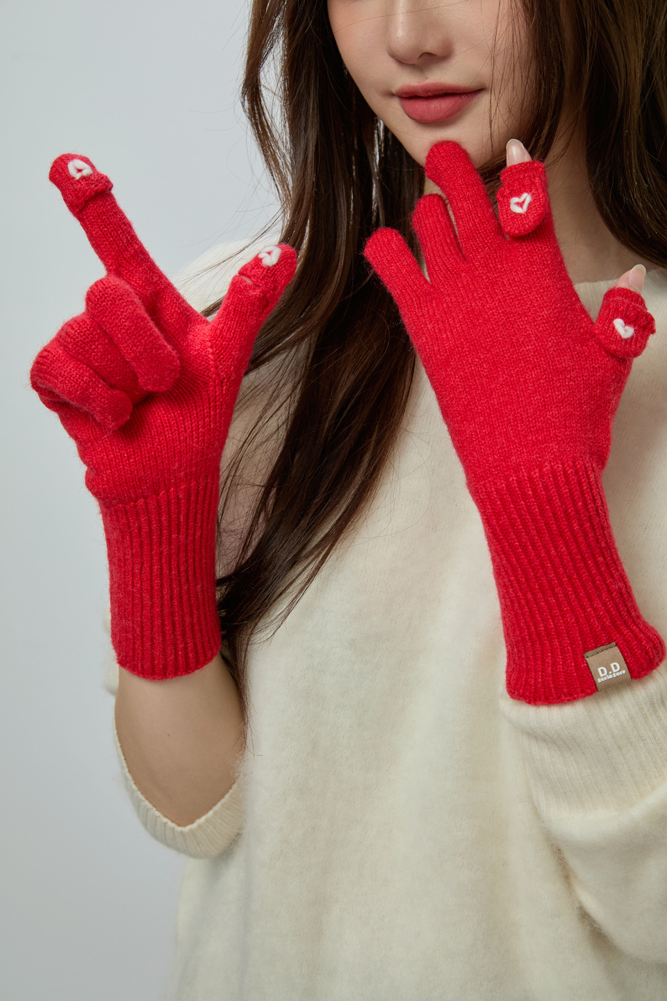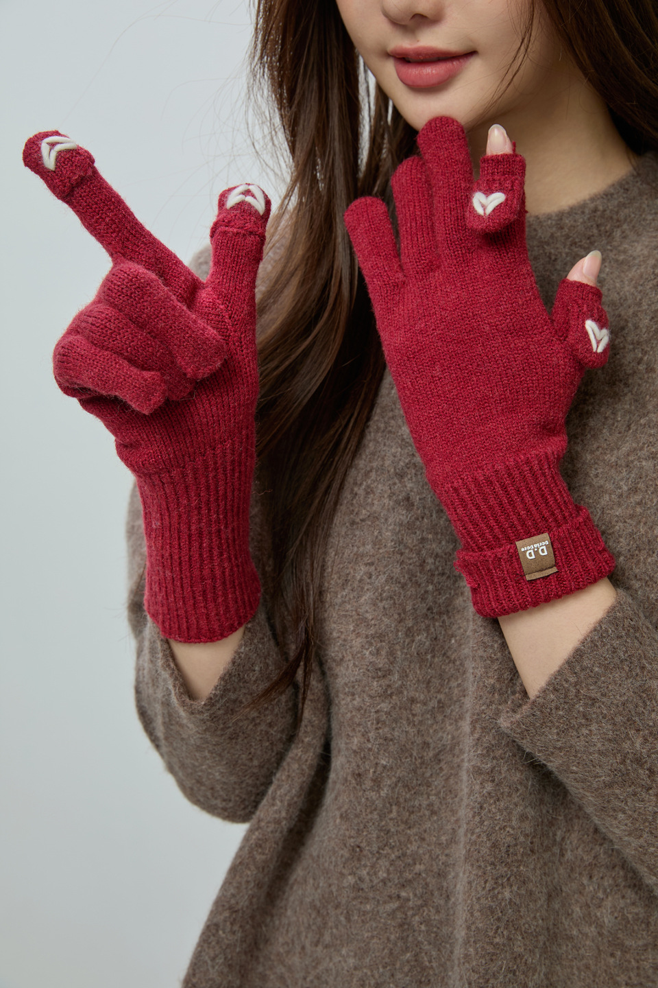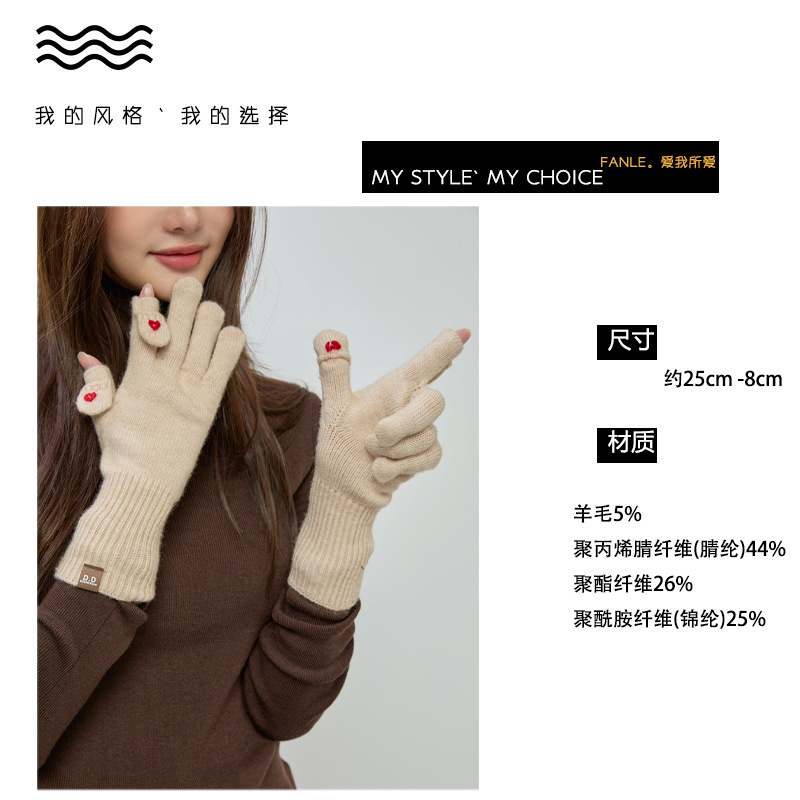 2024秋冬ウールニット愛刺繍手袋女性毛糸露指タッチパネル保温自転車学生防寒