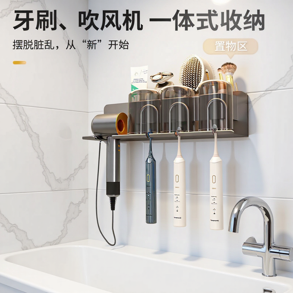 パンチフリーのアルミニウム合金歯ブラシ収納ラック、バスルームヘアドライヤー収納ラック、マウスウォッシュカップ収納および整理壁掛けラック