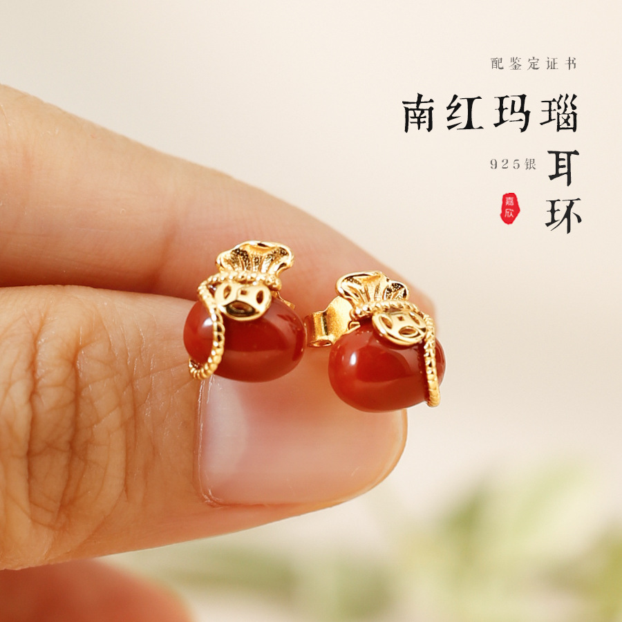 【商品名称】:925银镀金镶红玛瑙耳钉