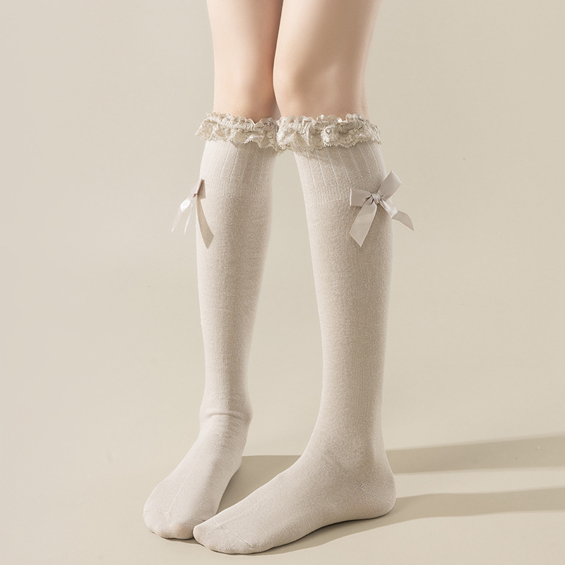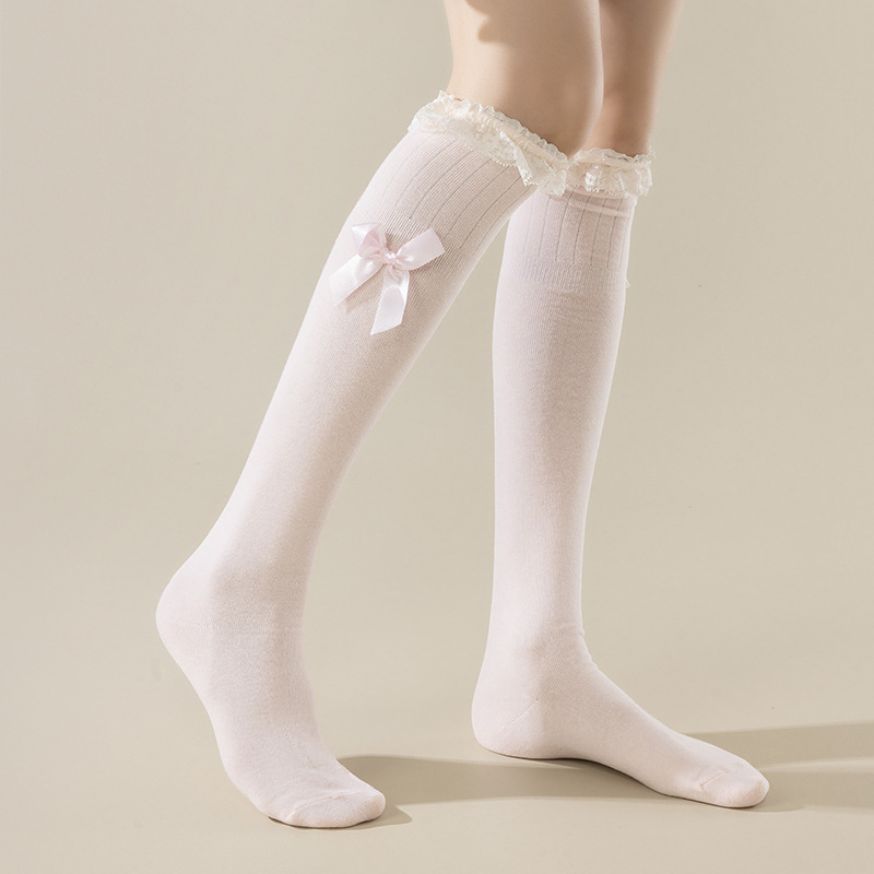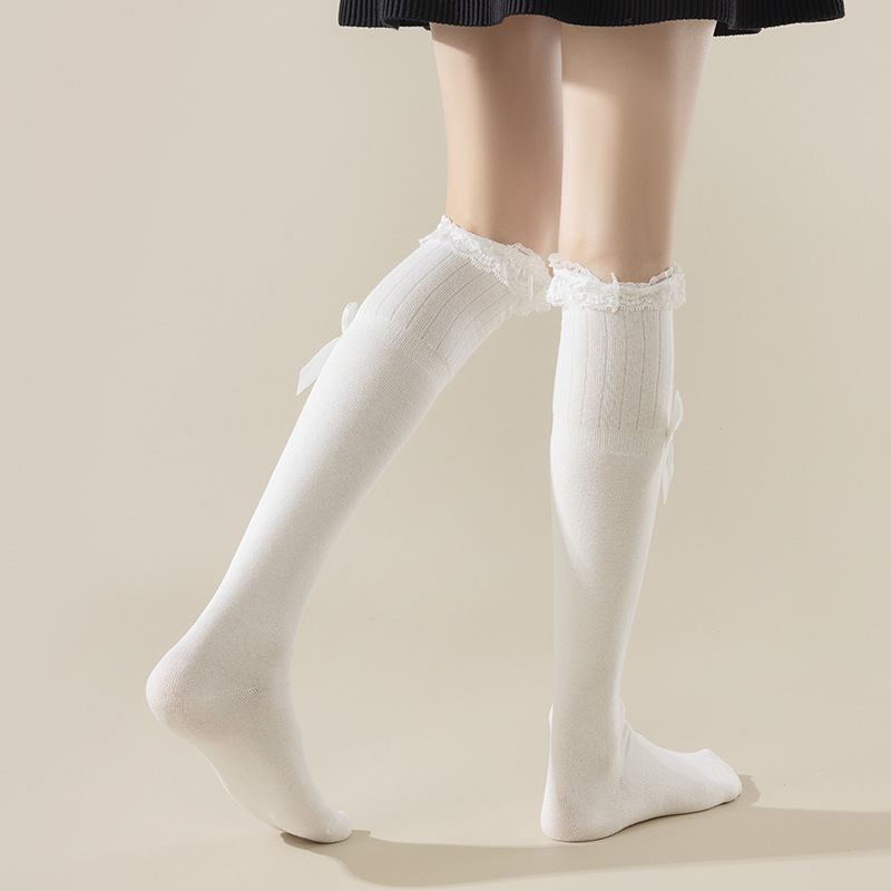 ロリータレース少女靴下秋冬新作純色蝶結び仙気範レース中筒靴下下腿靴下