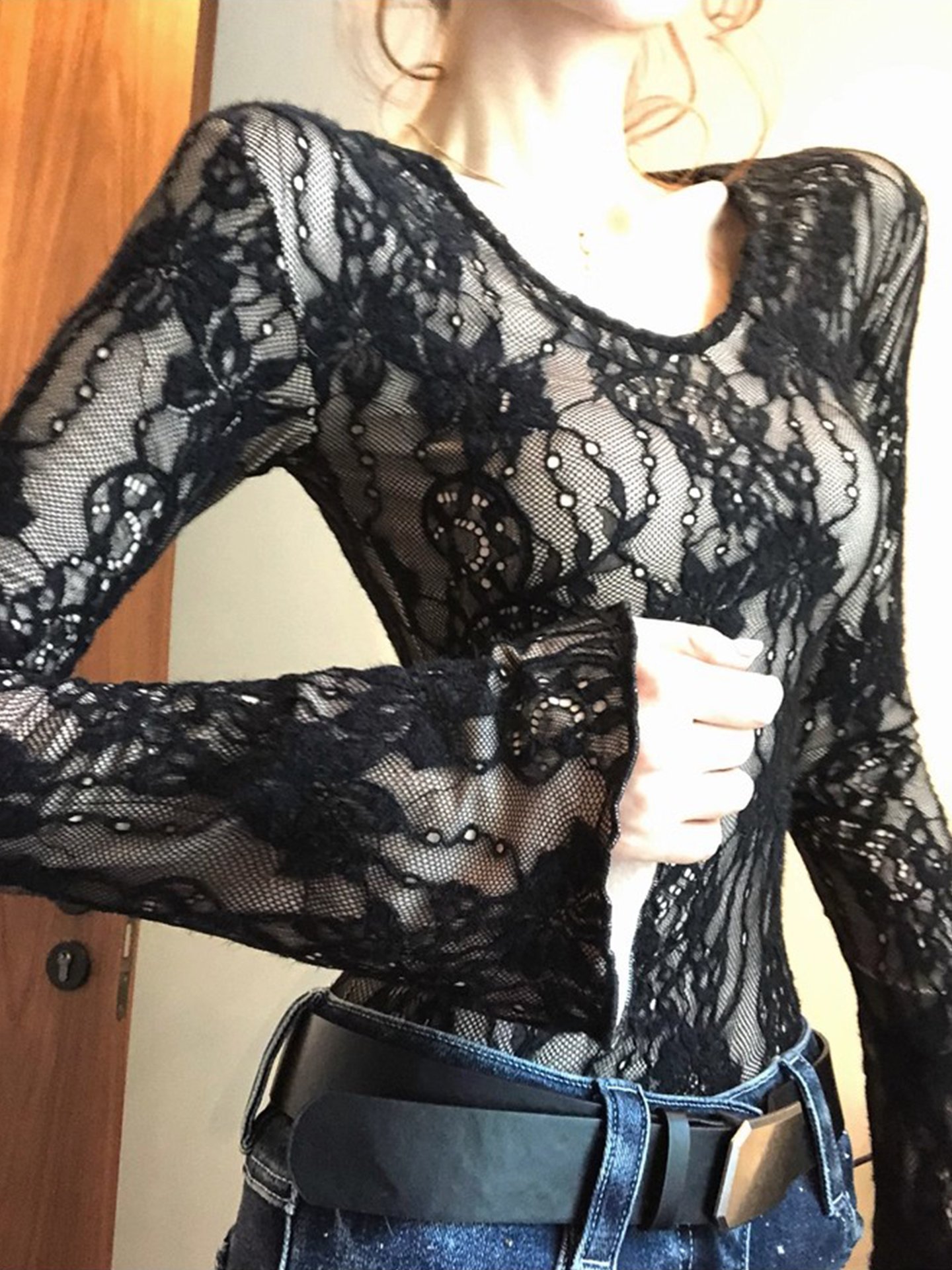 修身高级钩花新款百搭显瘦感内搭纯欲风打底上衣秋冬蕾丝打底衫女