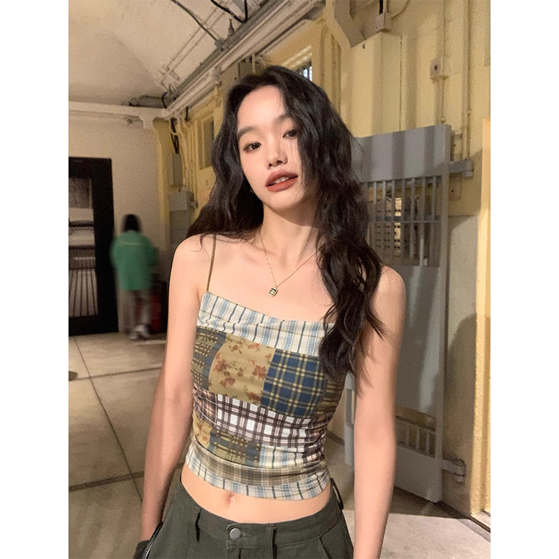 外穿复古设计夏季2025修身拼接新款格子吊带背心女无袖上衣感内搭