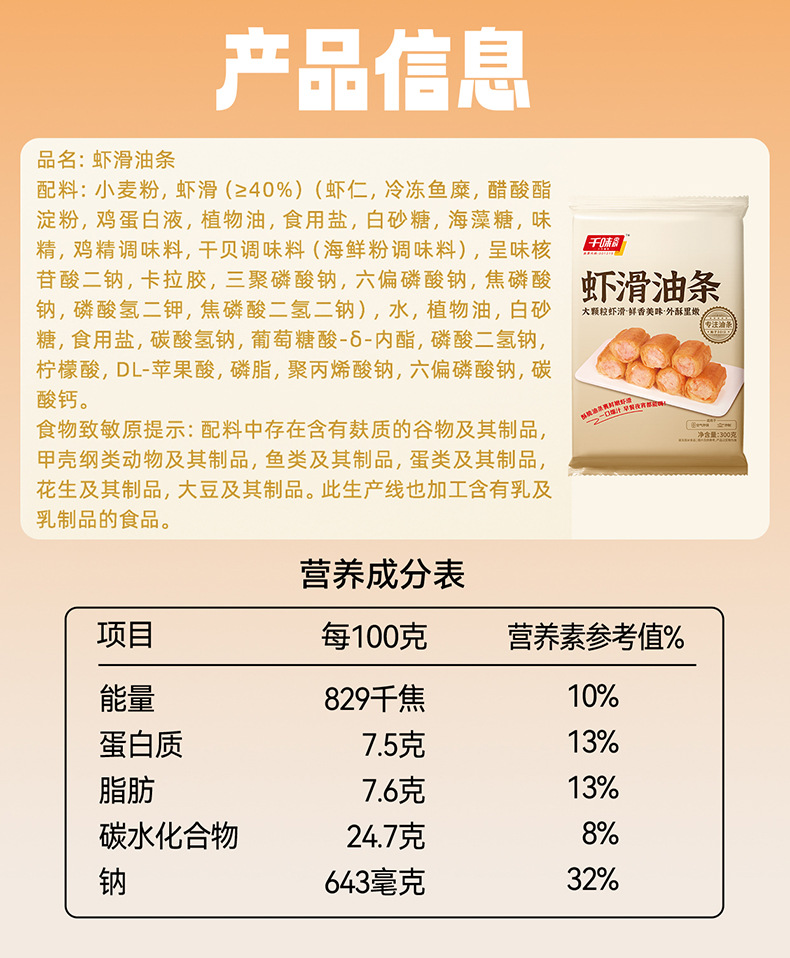 包装规格 千味餐饮300g虾滑油条*1袋,千味餐饮300g虾滑油条*2袋,千味餐饮300g虾滑油条*3袋,千味餐饮300g虾滑油条*4袋,千味餐饮300g虾滑油条*5袋,千味餐饮300g虾滑油条*6袋,千味300g脆皮香蕉*1袋