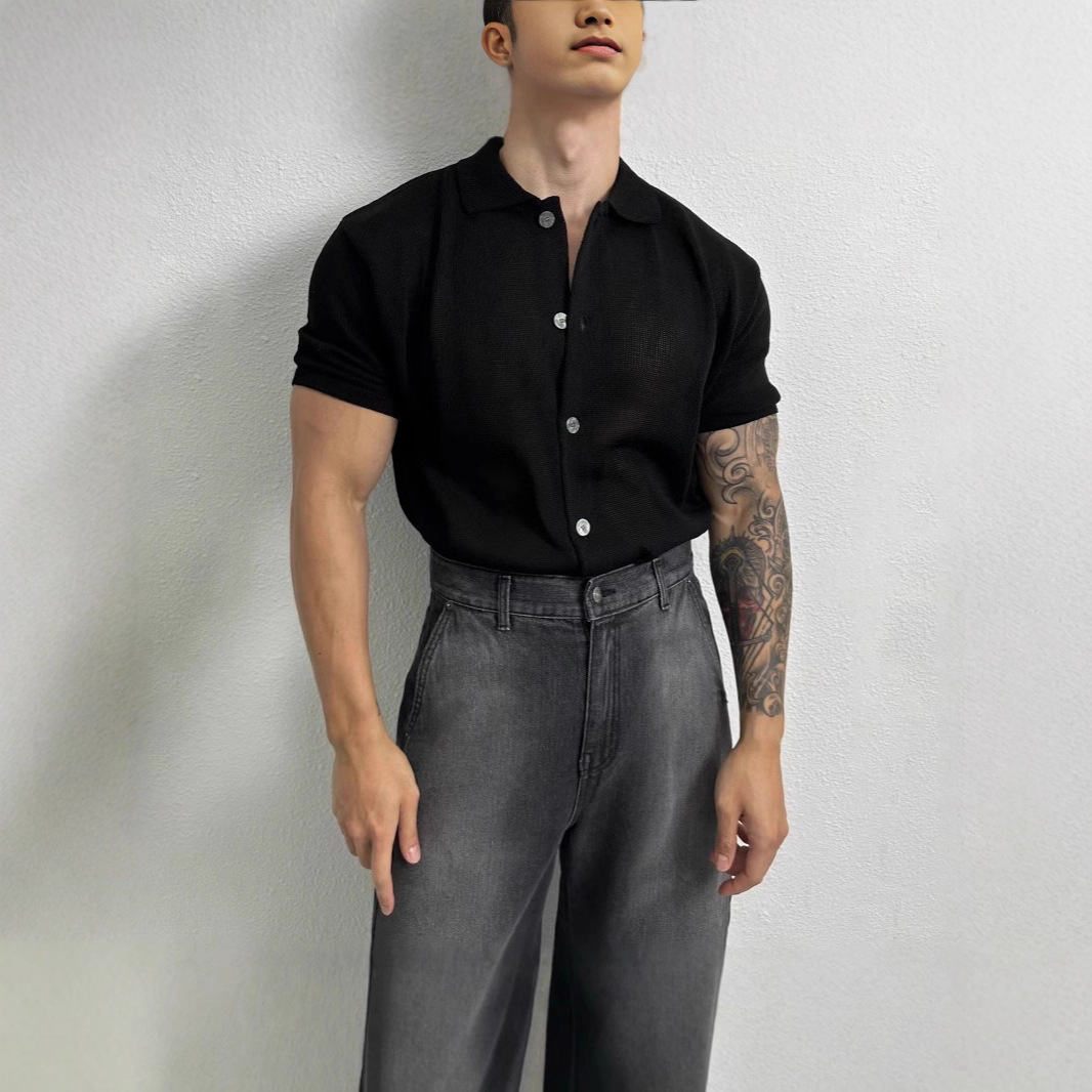 夏ポロカラーカーディガン Tシャツアイスシルククールメンズライトラグジュアリースタイルセータートレンディなメンズ通気性ルーズ半袖メンズ