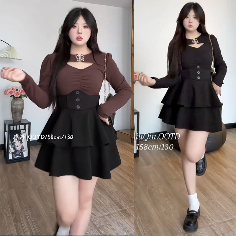 大码学院风蕾丝边拼接上衣女春冬胖mm鱼骨束腰裙甜美气质显瘦套装