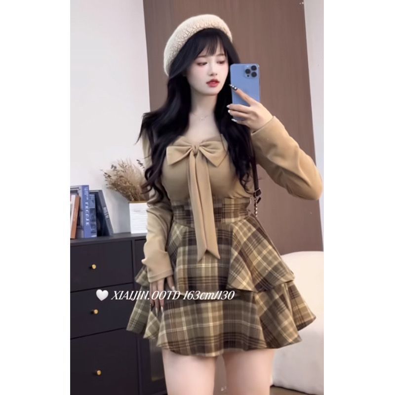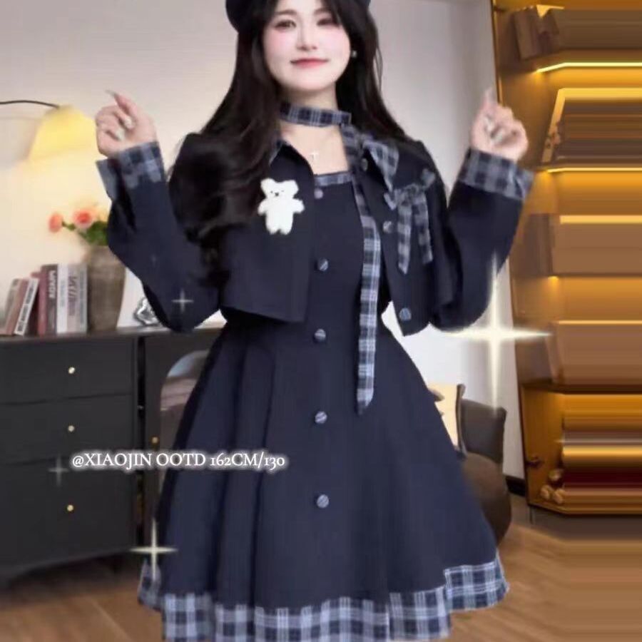 大きいサイズの学院の風の蝶結びの底の上着の女性の秋冬の太っているmmのウエストの格子縞のスカートの甘い気質はやせているスーツを現します。