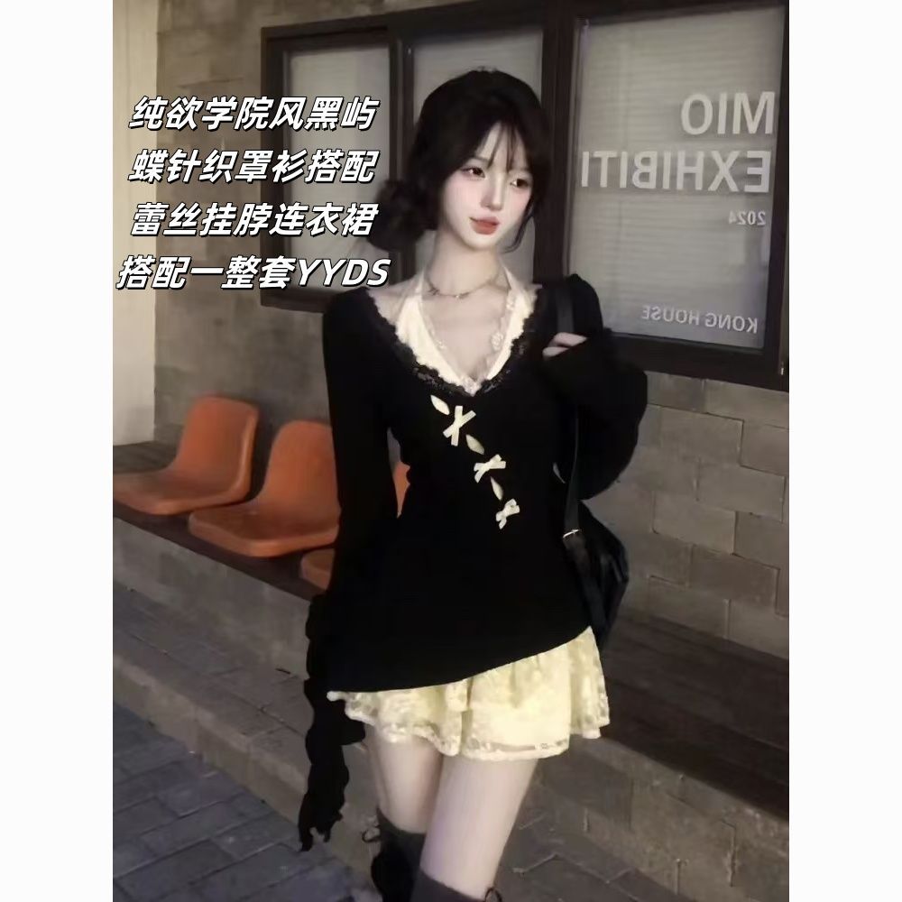 瑞茜·威瑟斯 秋冬纯欲风显瘦针织罩衫蕾丝内搭连衣裙两件套