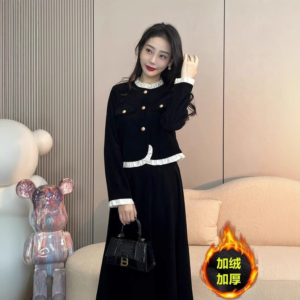小香風スーツの女性は秋冬にベルベットの新しい洋気が流行して、気質の短いコートの半身のスカートのセットを着ている