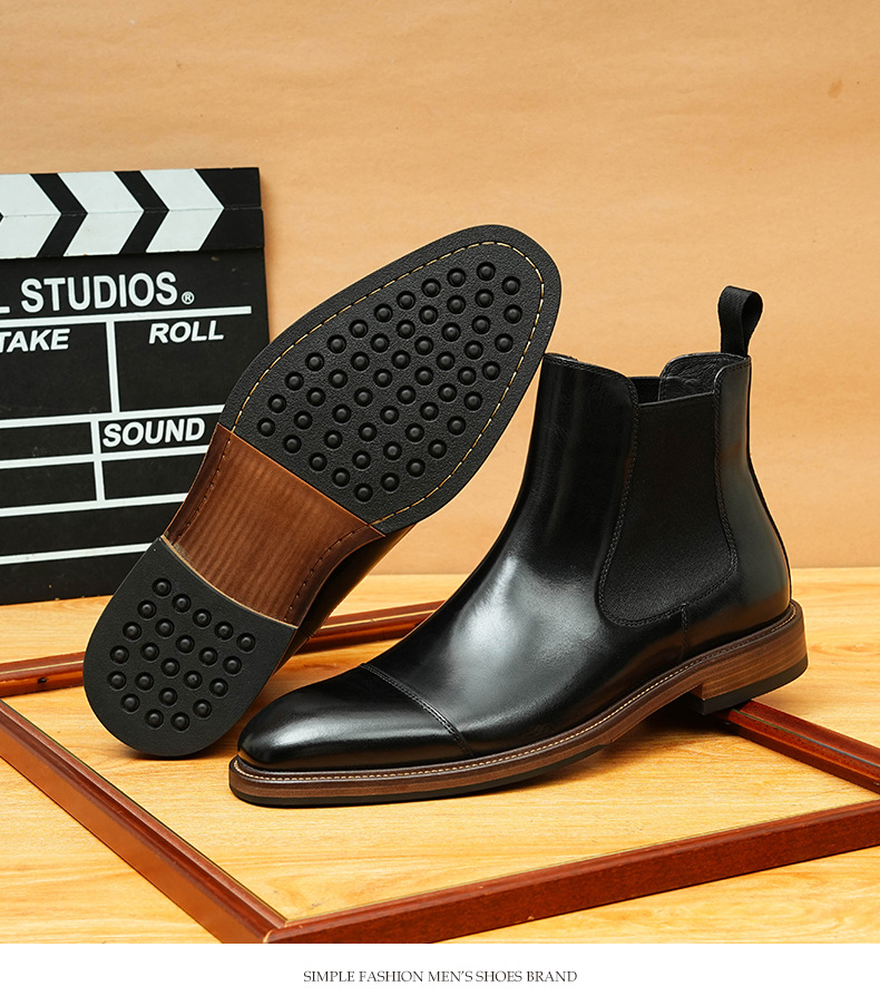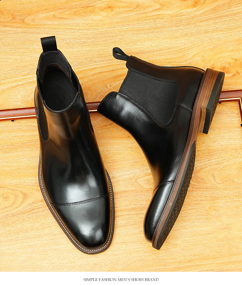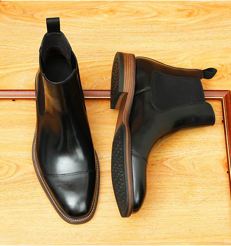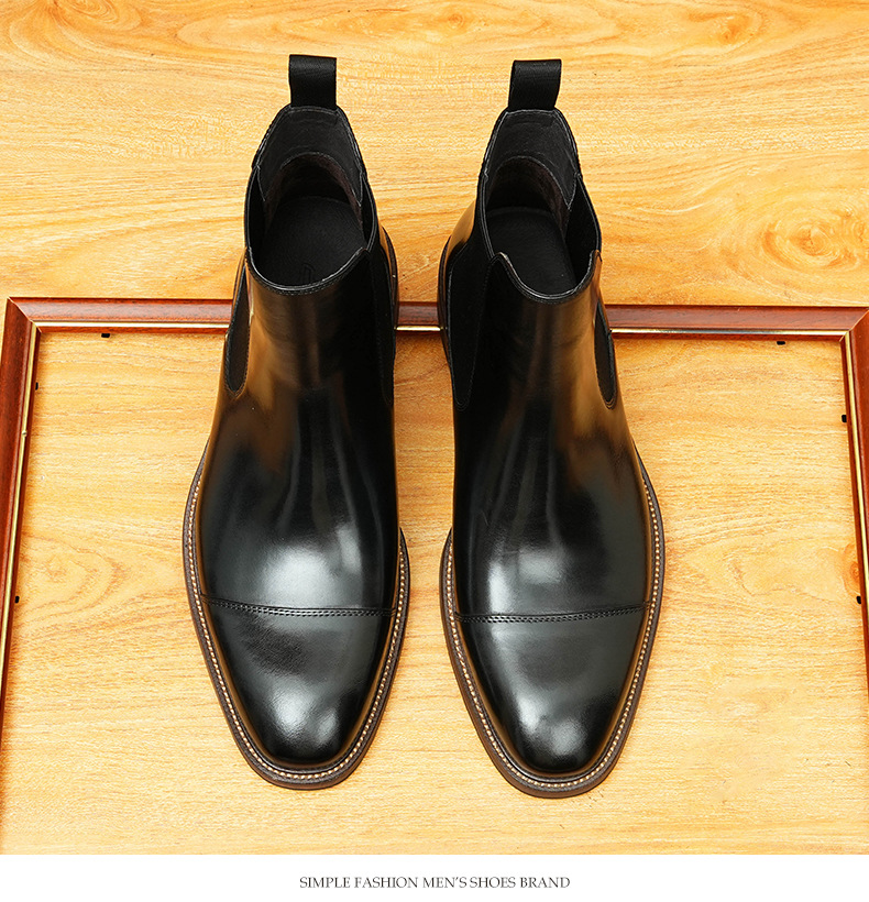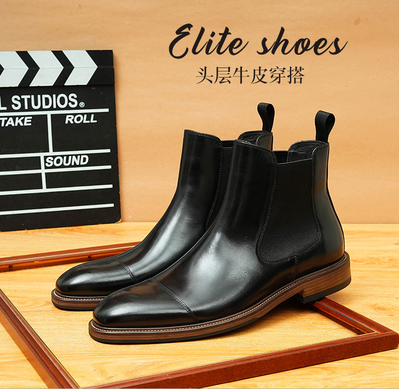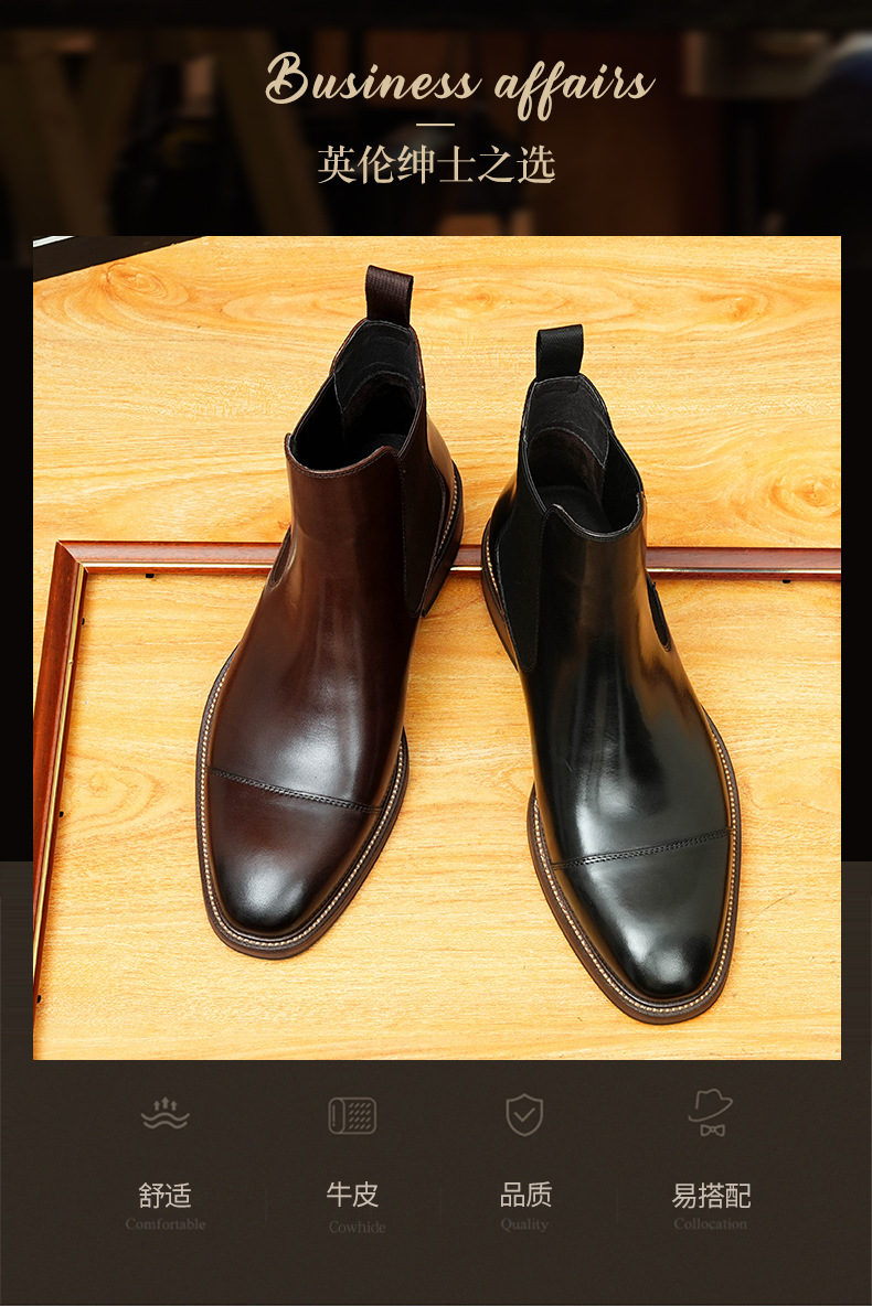 开边珠切尔西靴男方头英伦风商务正装短靴真皮一脚蹬高帮男鞋皮鞋