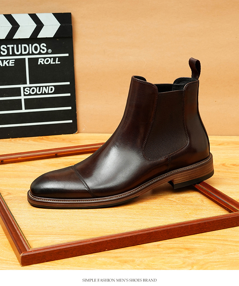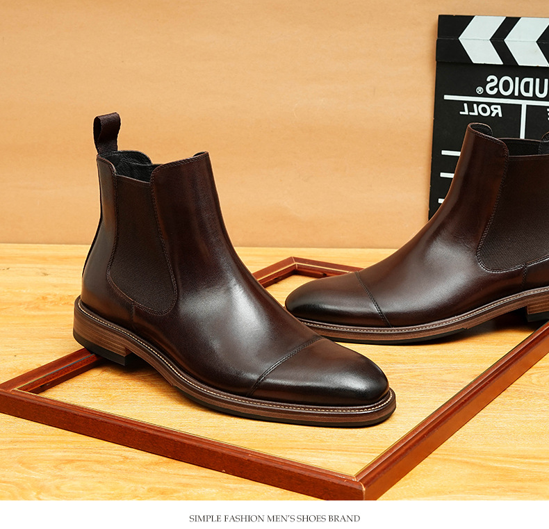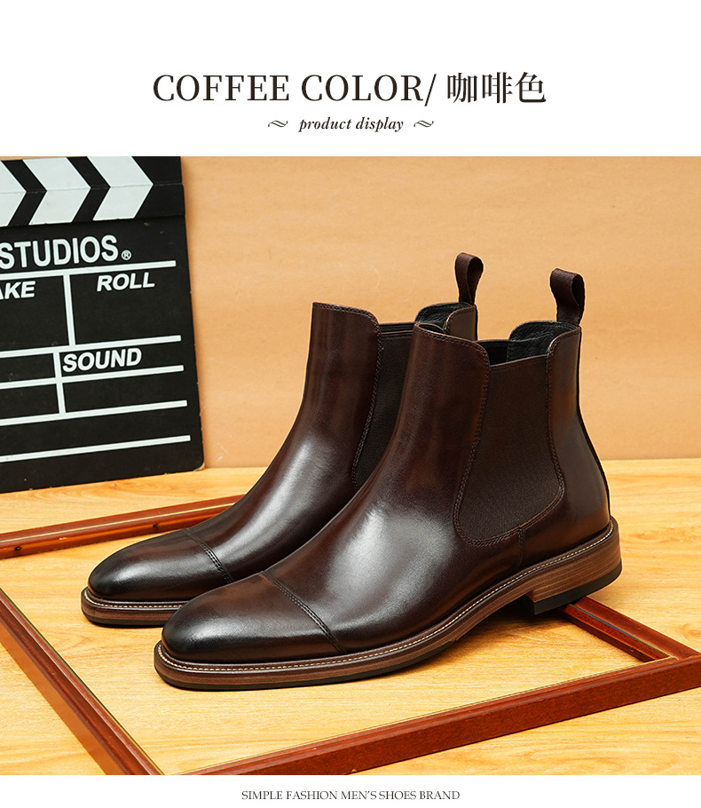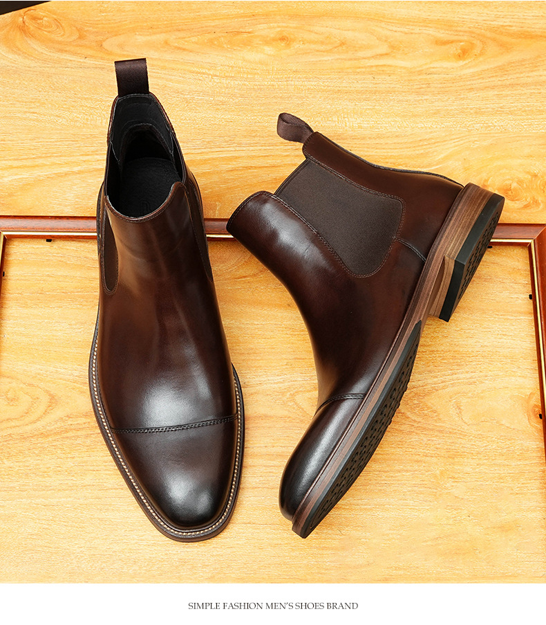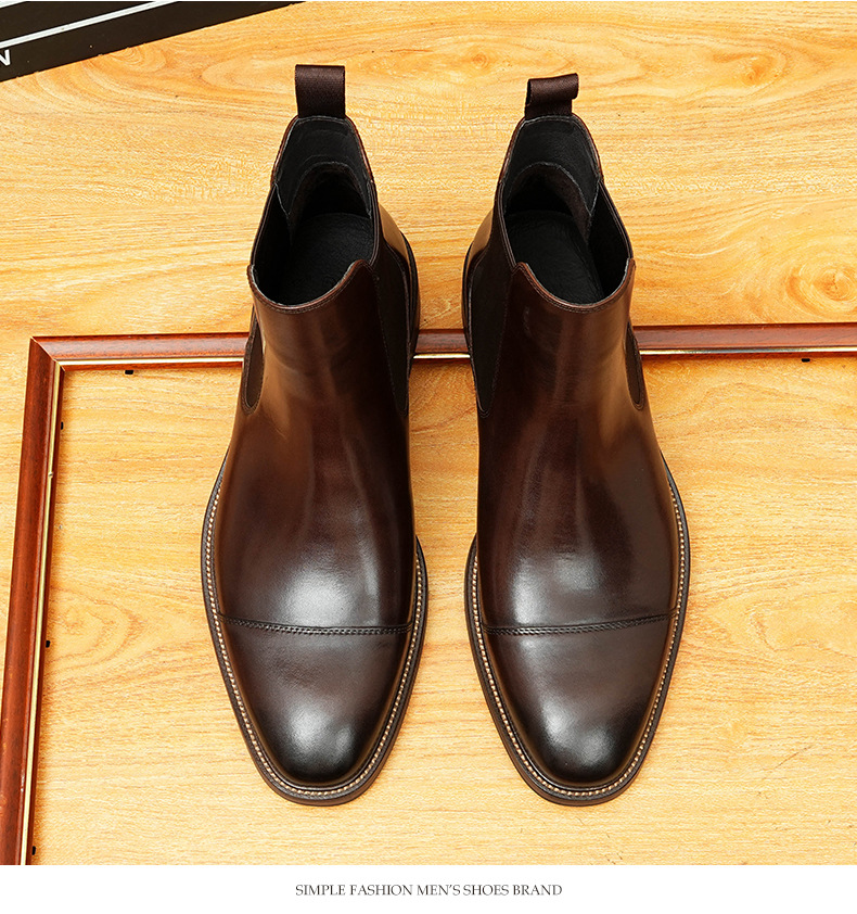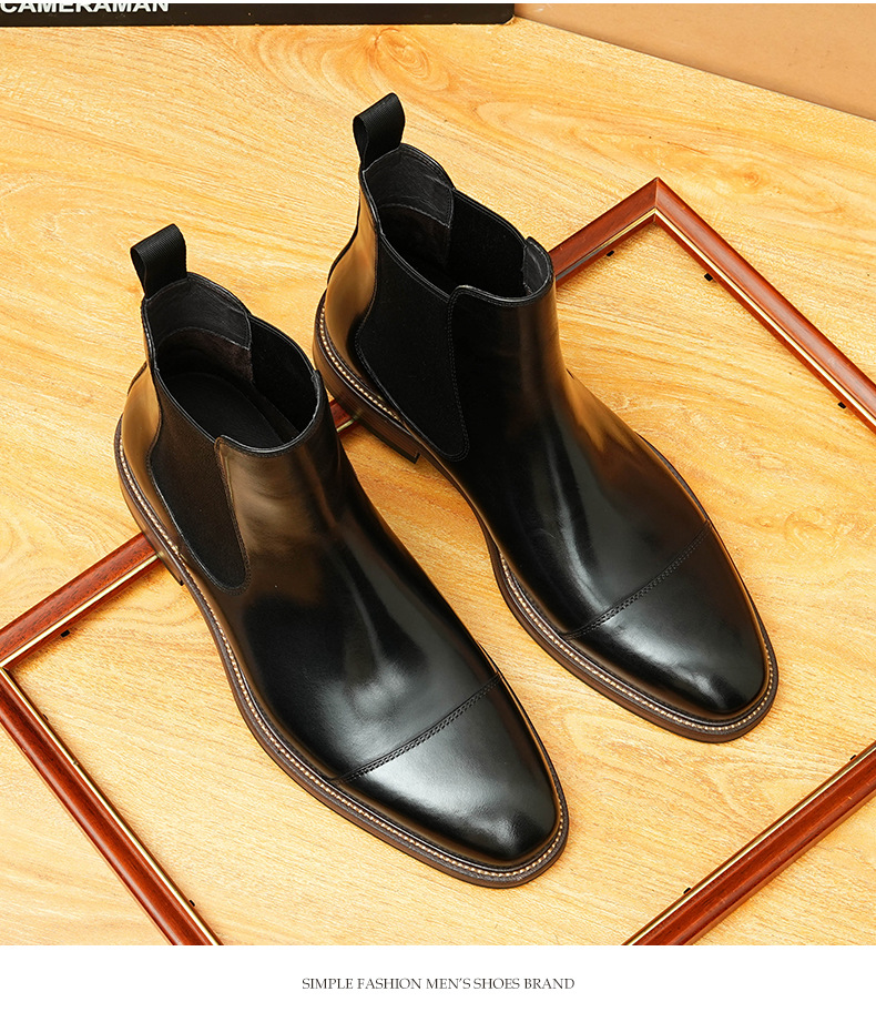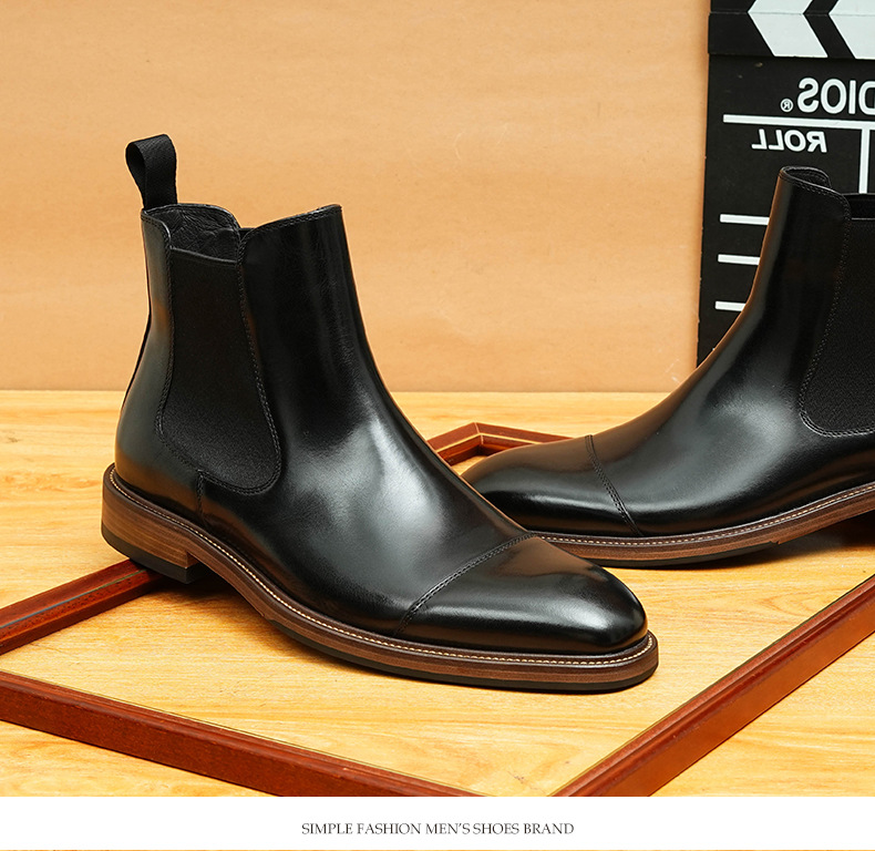 开边珠切尔西靴男方头英伦风商务正装短靴真皮一脚蹬高帮男鞋皮鞋