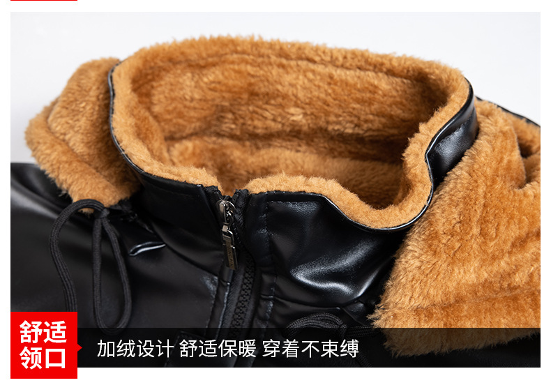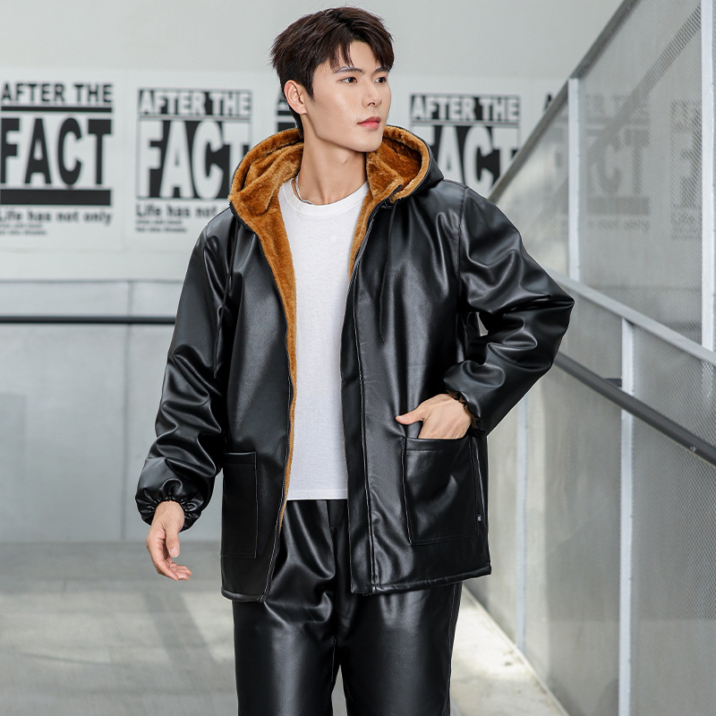皮衣皮裤男工作服套装加绒加厚外卖机车挡风保暖立领棉衣连帽外套