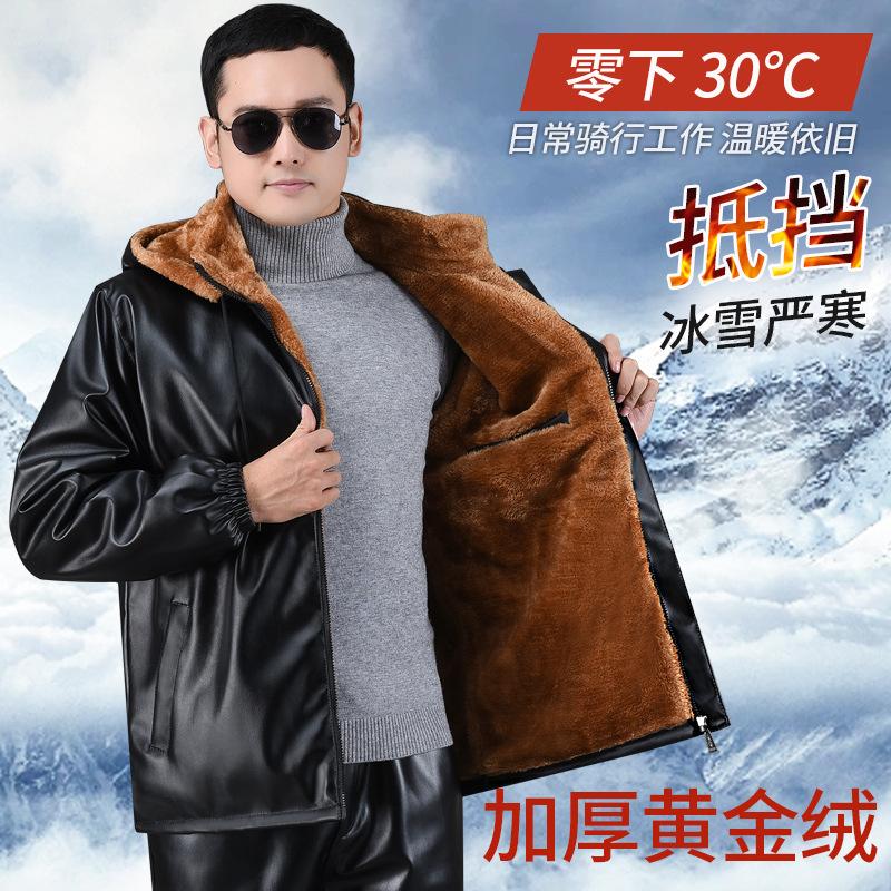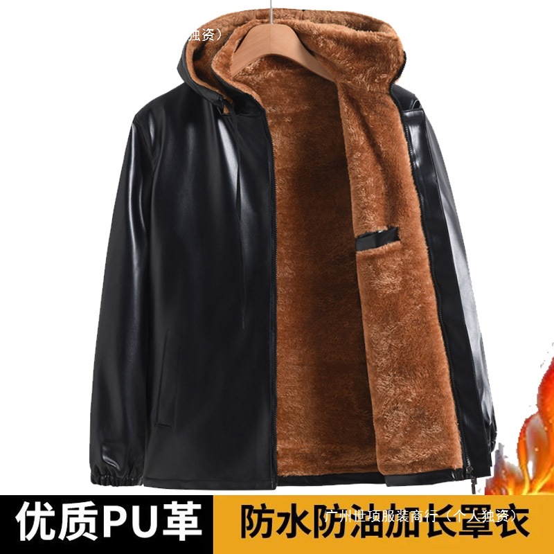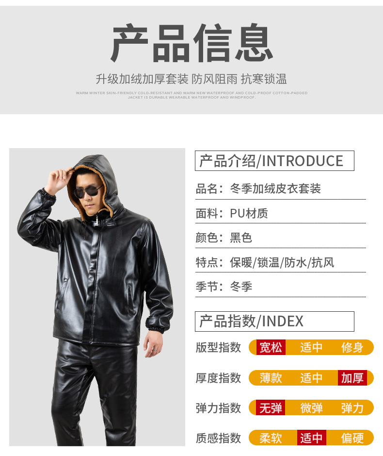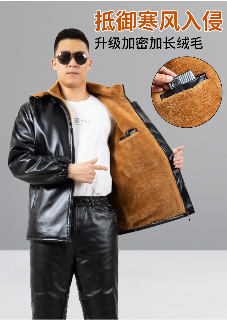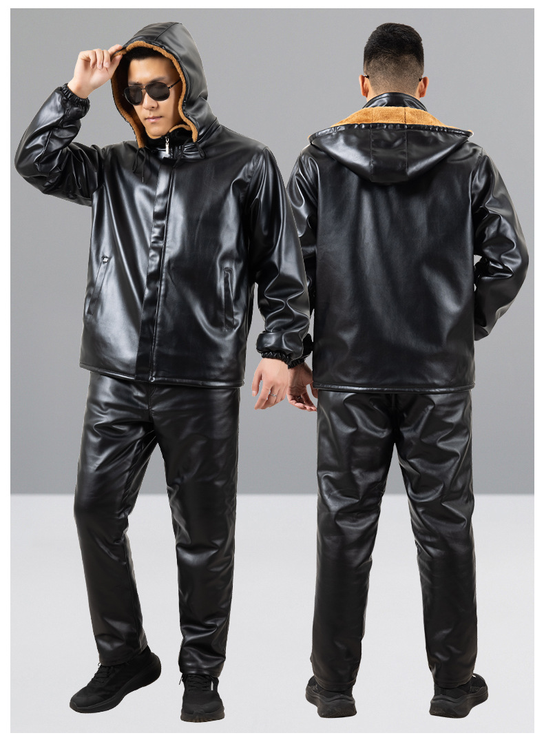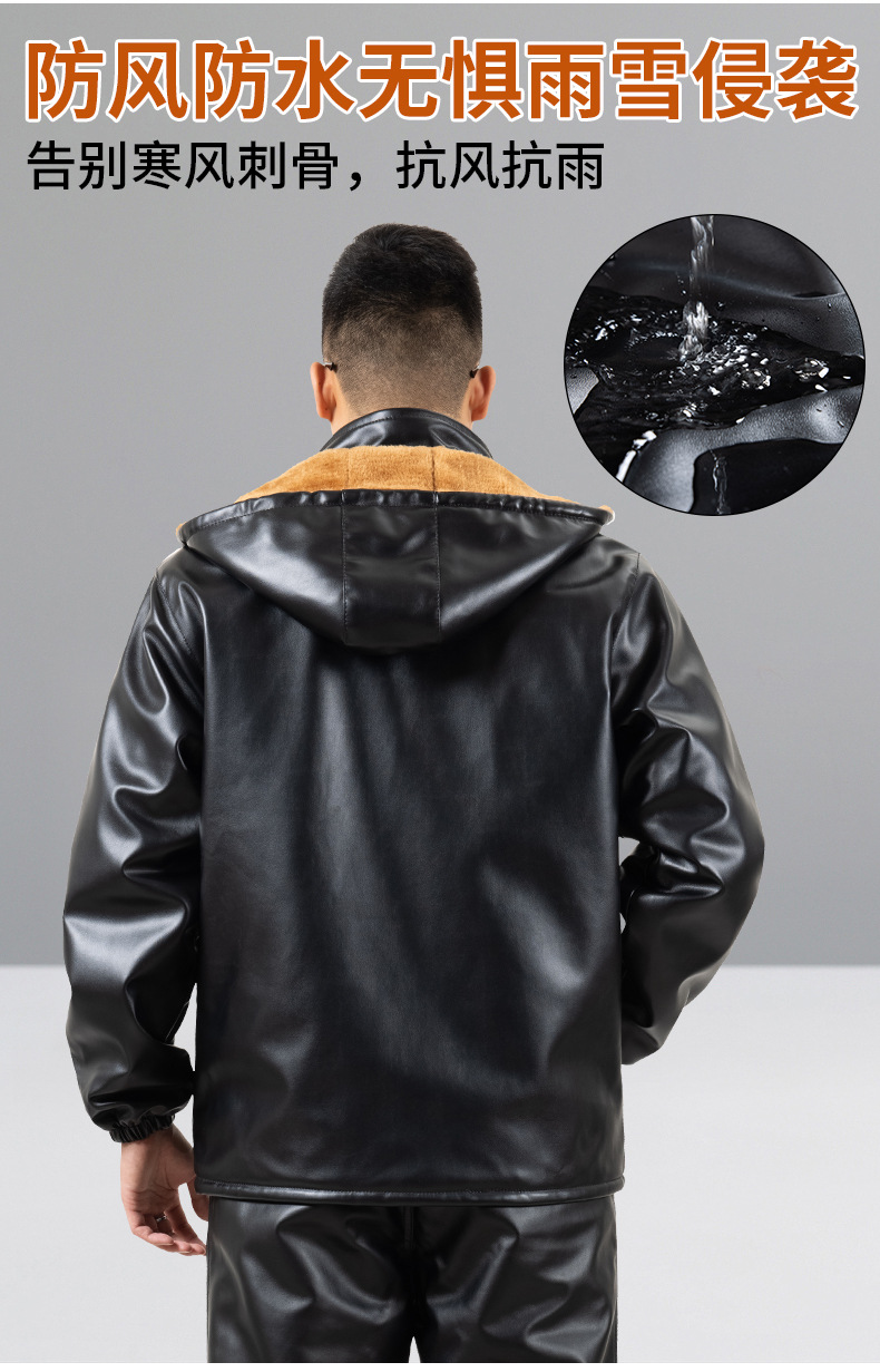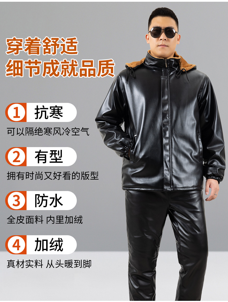 加绒加厚拆帽皮衣皮裤皮套装男保暖冷库工作服宽松防水皮棉衣外套