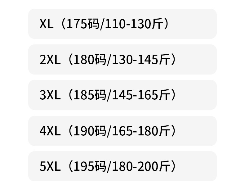 尺码 XL/175码(110-130斤),2XL/180码(130-145斤),3XL/185码(145-165斤),4XL/190码(165-180斤),5XL/195码(180-200斤)