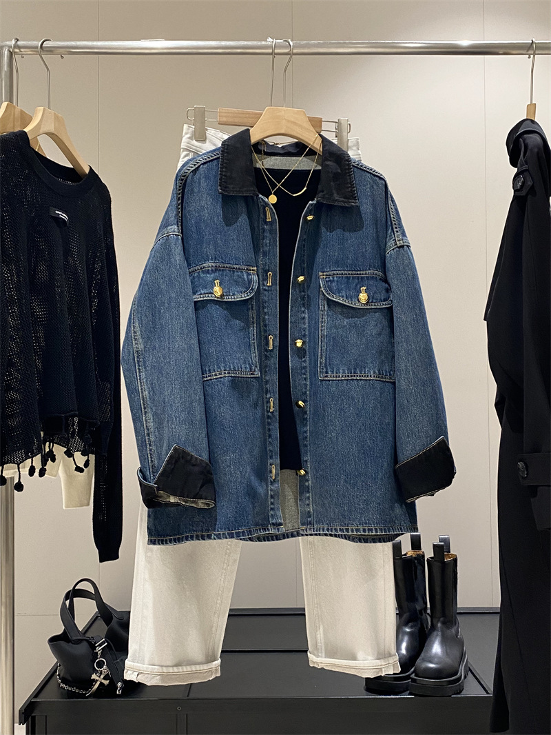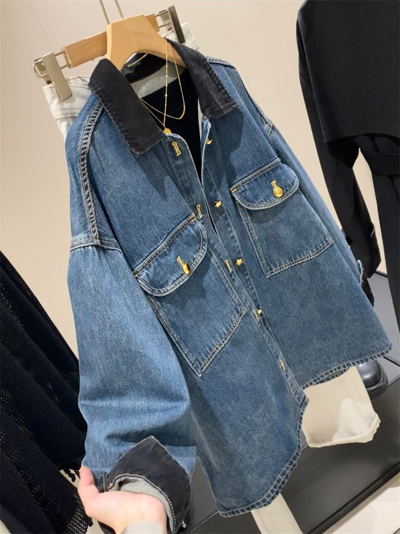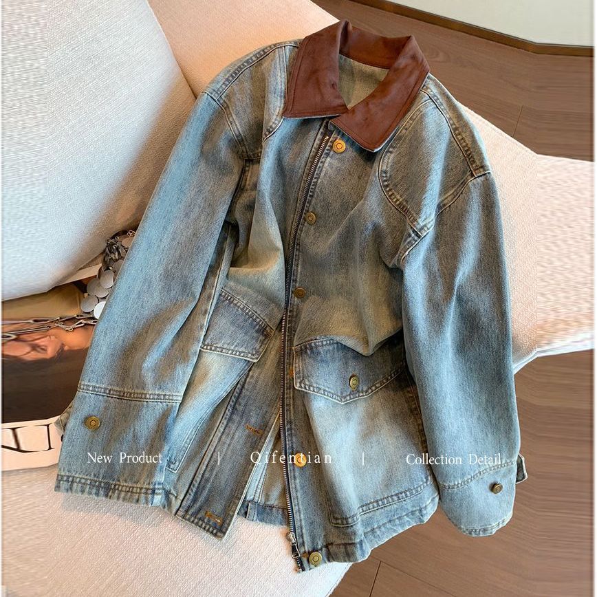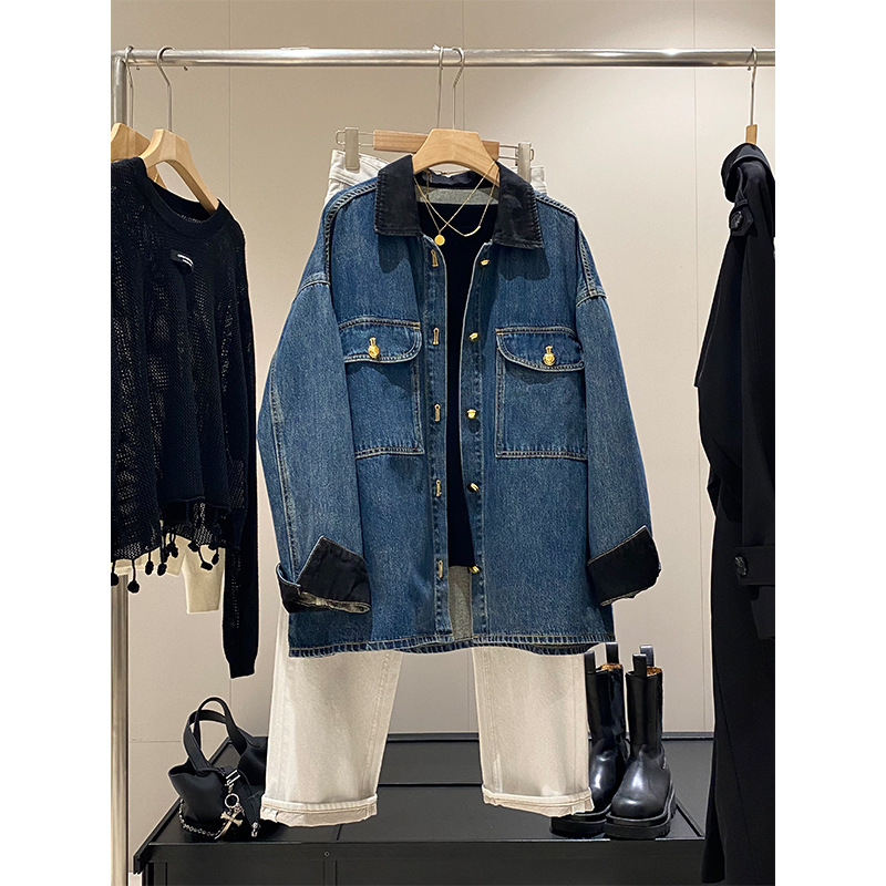蓝色复古撞色麂皮绒拼接牛仔外套女秋新款宽松休闲百搭中长款夹克