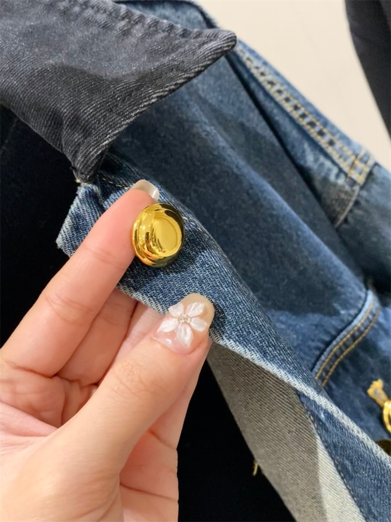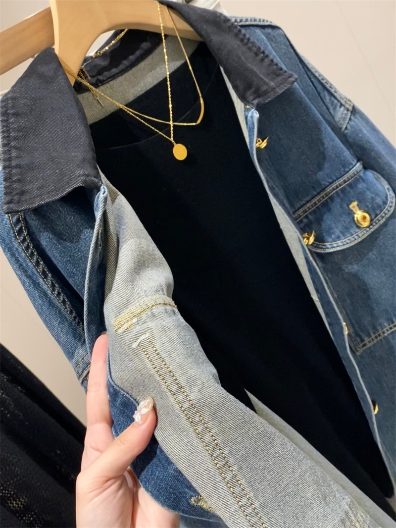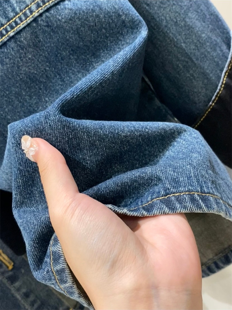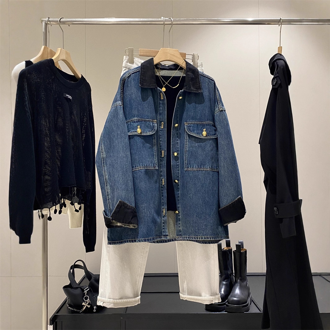 蓝色复古撞色麂皮绒拼接牛仔外套女秋新款宽松休闲百搭中长款夹克