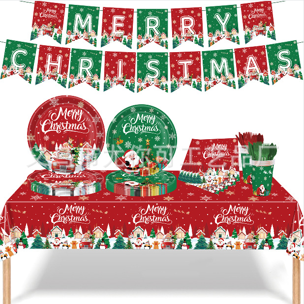 新しいクリスマスパーティー用使い捨て紙テーブルクロス、紙皿、食器セット、誕生日パーティーの装飾