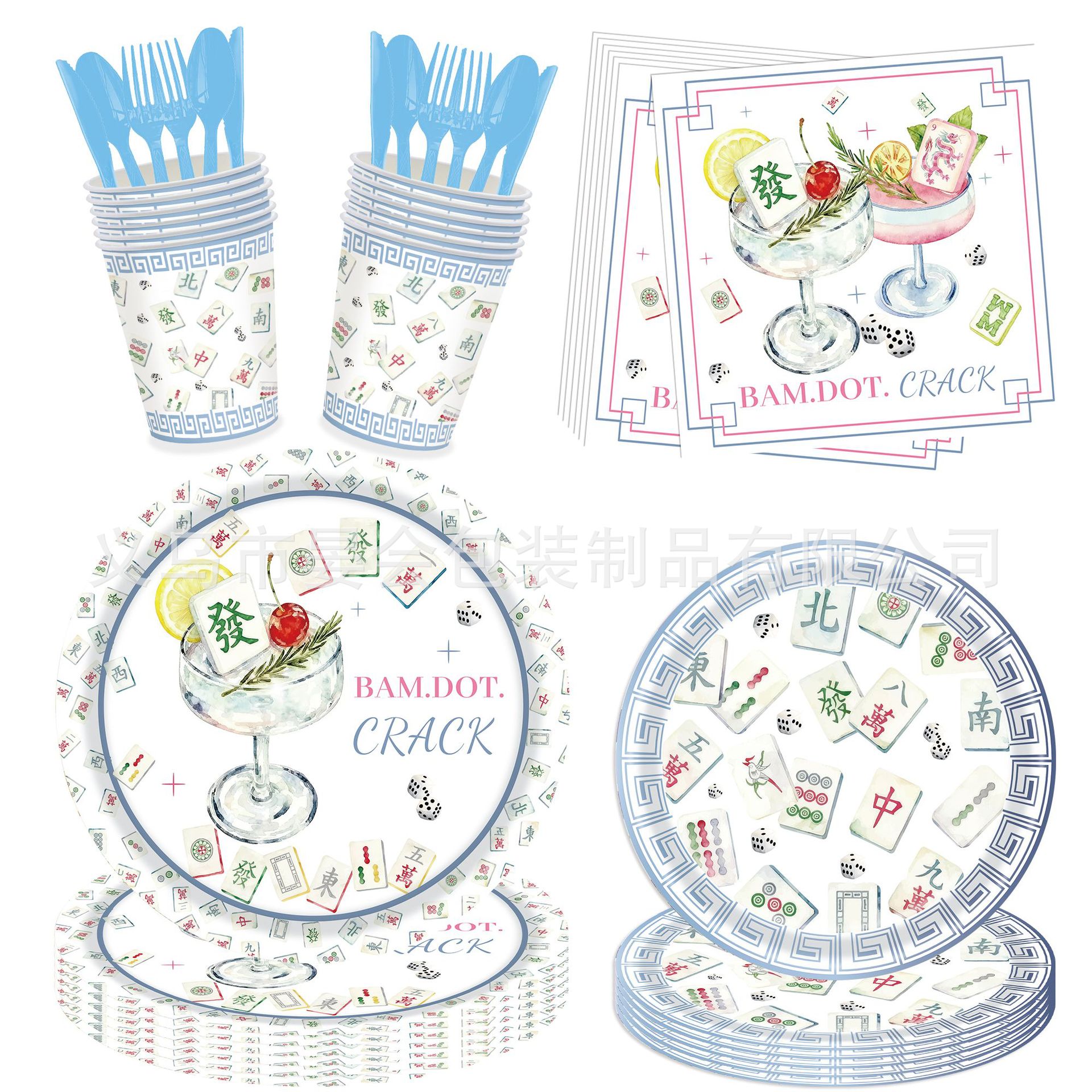 新款麻将主题中国风派对餐具纸盘纸巾纸杯桌布等一次性装饰