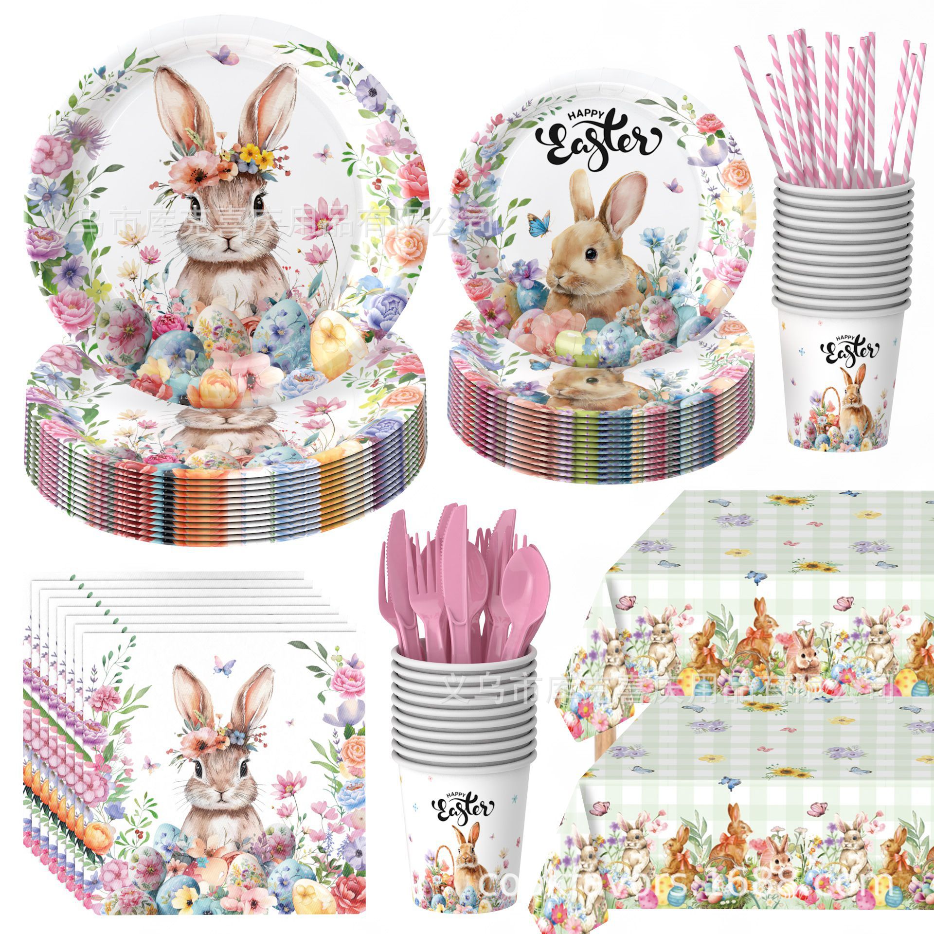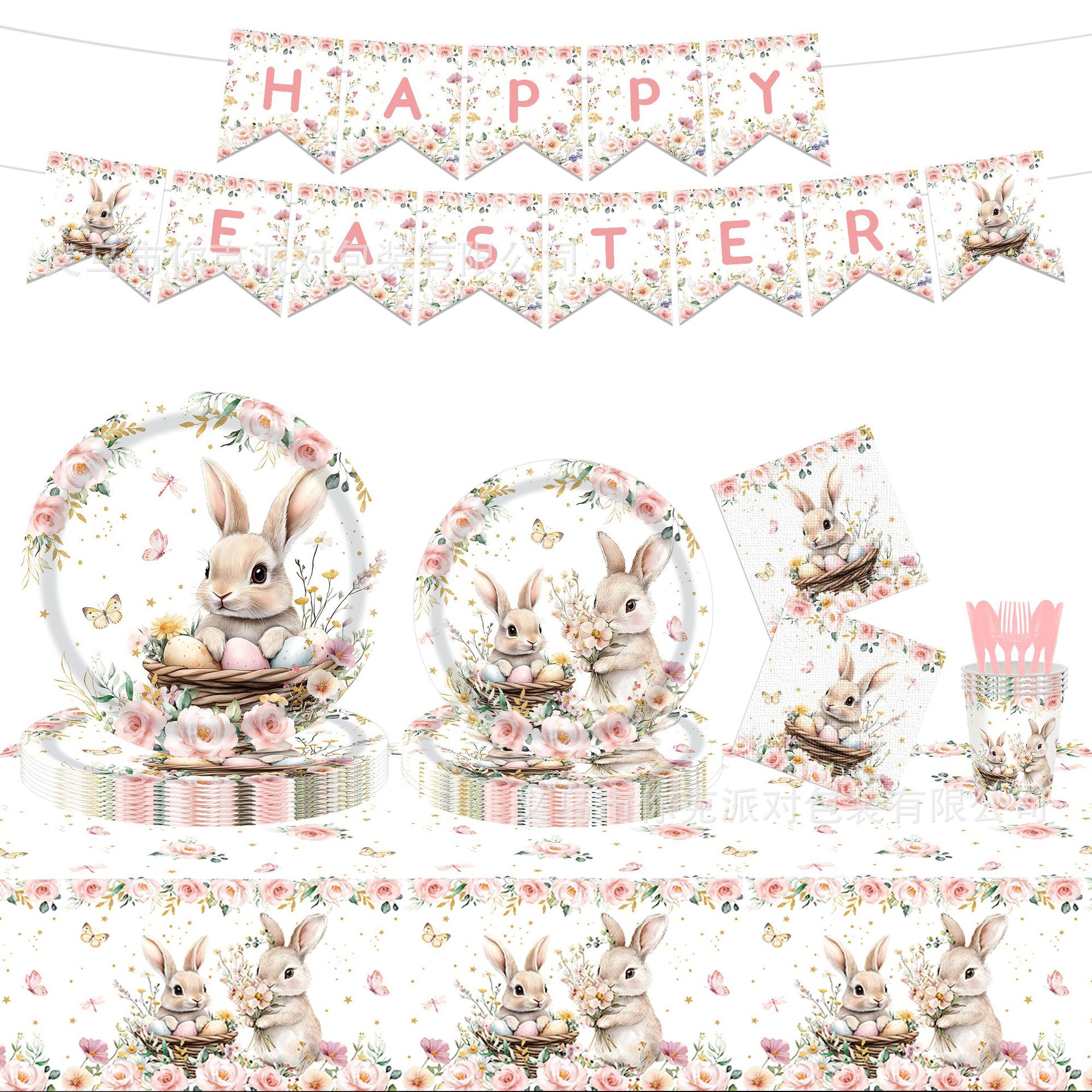 新款复活节兔子主题花卉派对用品 一次性桌布派对纸盘纸巾刀叉勺