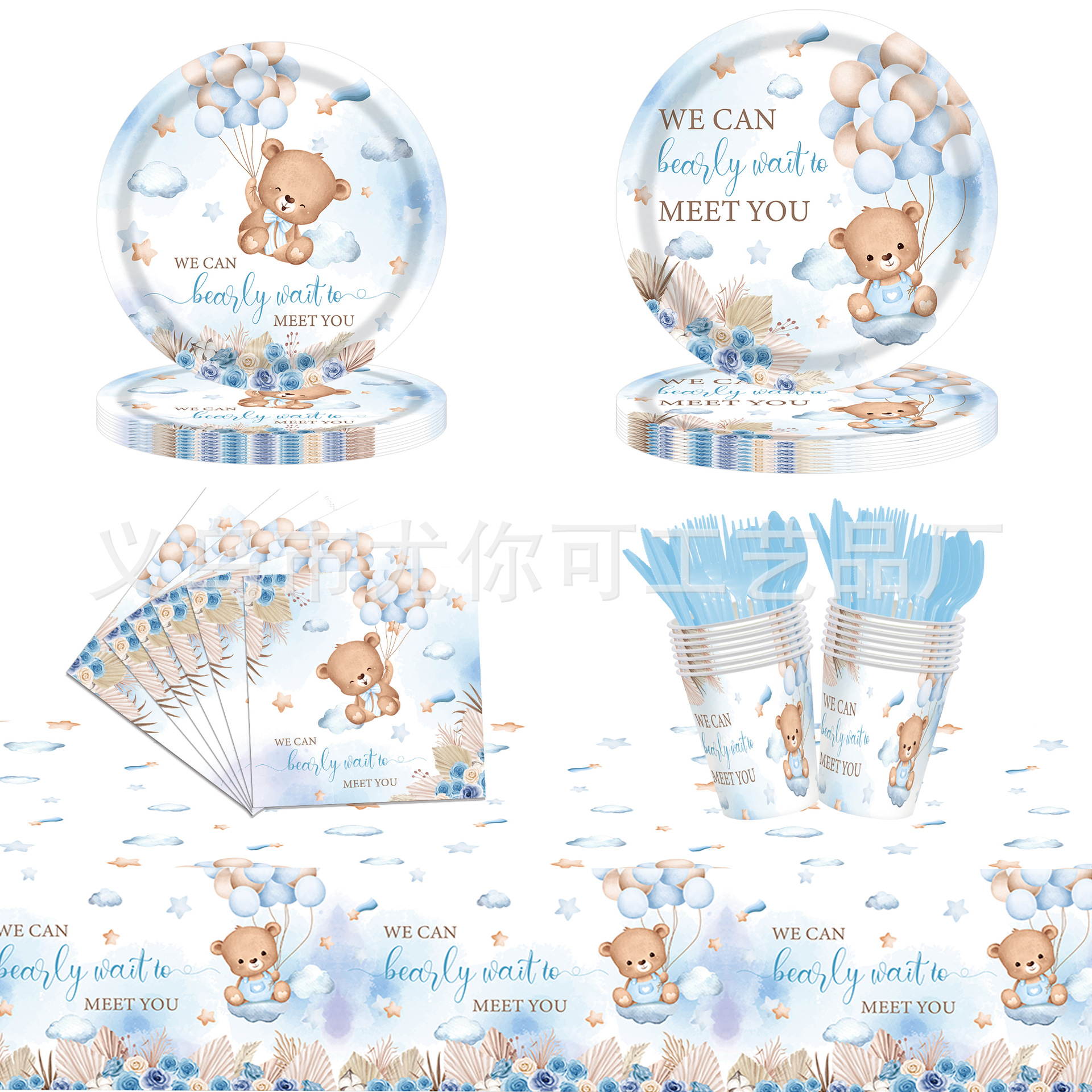 新しい青い水彩テディベアベビーショーパーティーデコレーションベビーシャワーテーマ使い捨て紙皿とペーパータオル