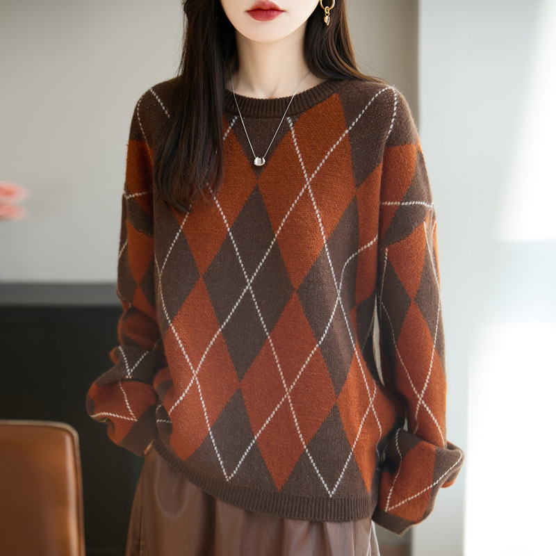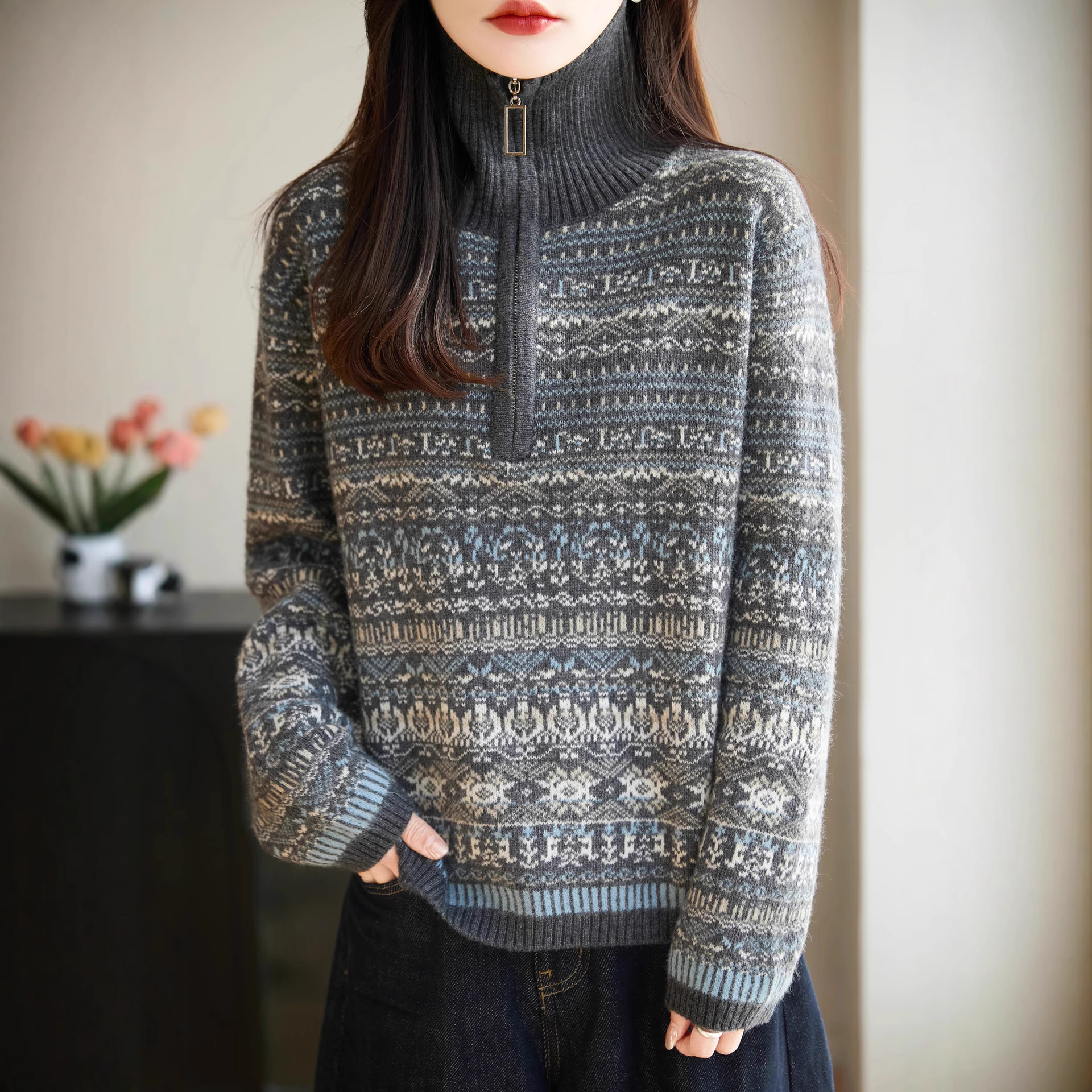 加厚复古费尔岛提花针织衫女半拉链宽松毛衣打底衫女装长袖上衣