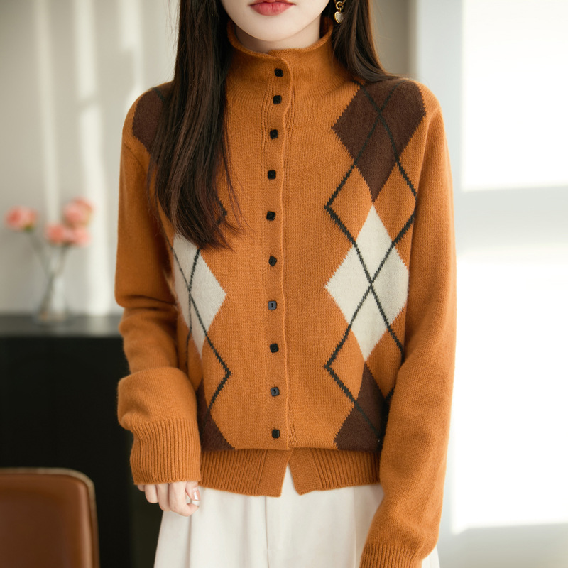 复古菱格高领针织开衫女秋冬新款洋气减龄百搭毛衣女装外套上衣