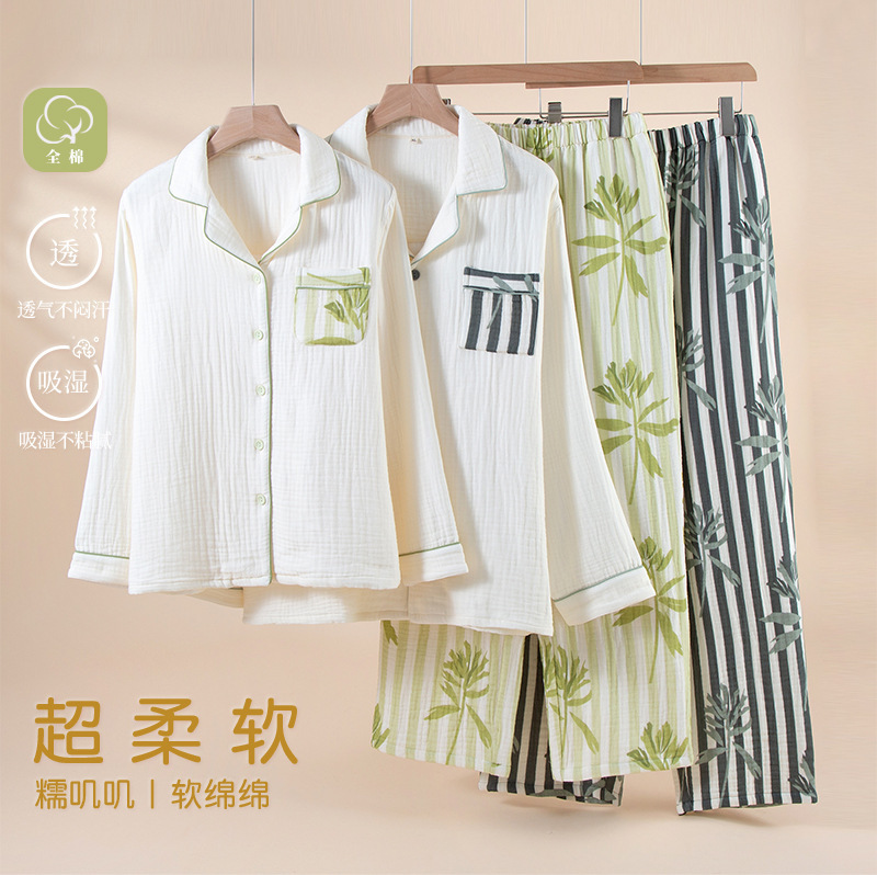 纯棉纱布加厚睡衣男女士春秋冬季国风四层纱布情侣居家套装可外穿