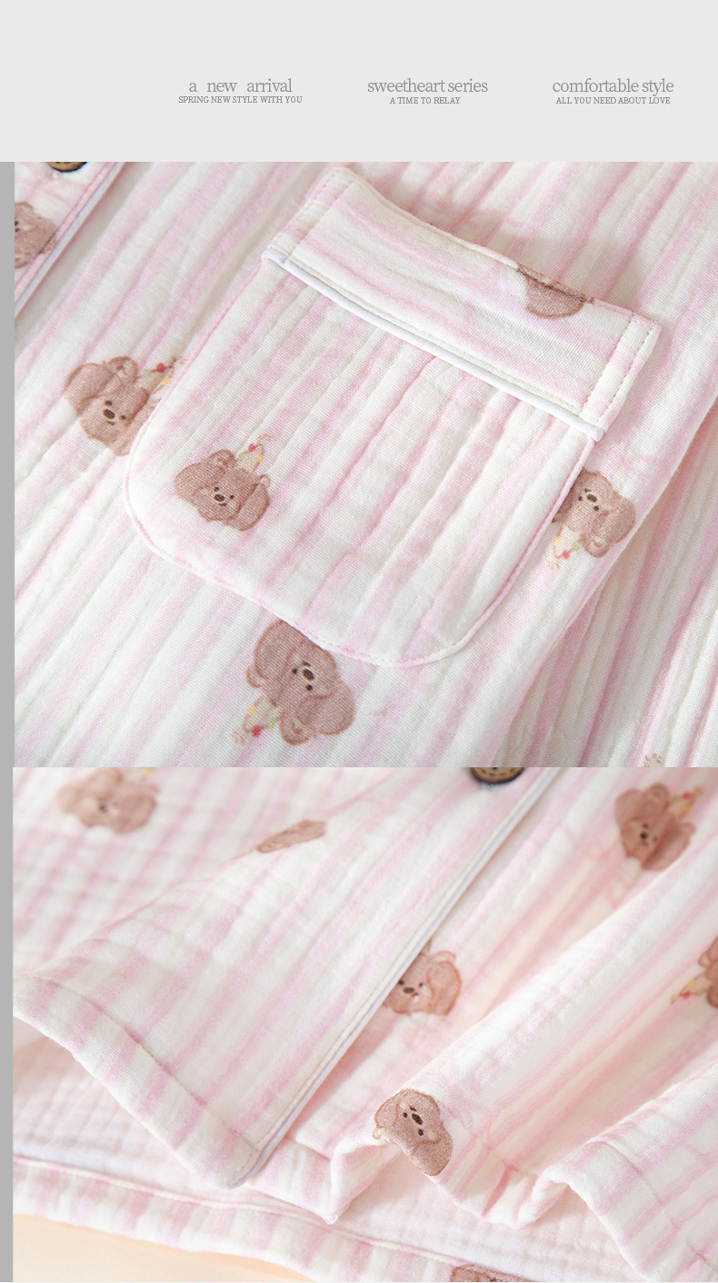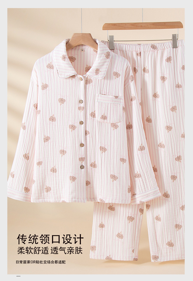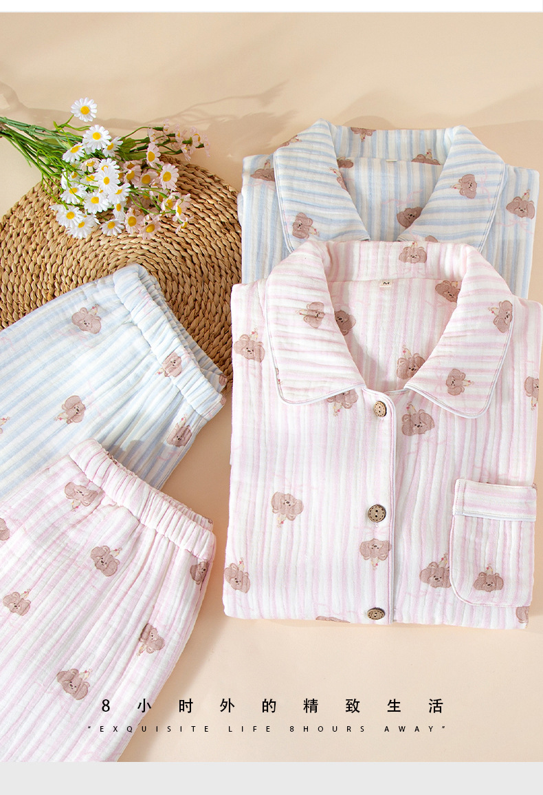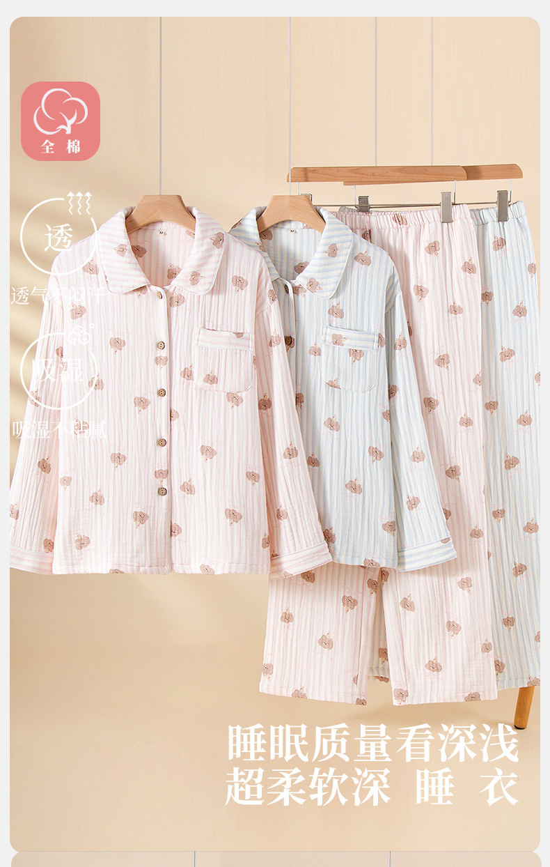 纯棉四层纱布睡衣女秋冬款暖棕条纹熊长袖长裤娃娃领加厚家居服套