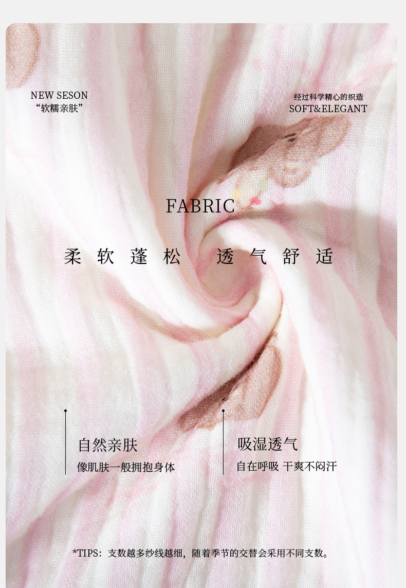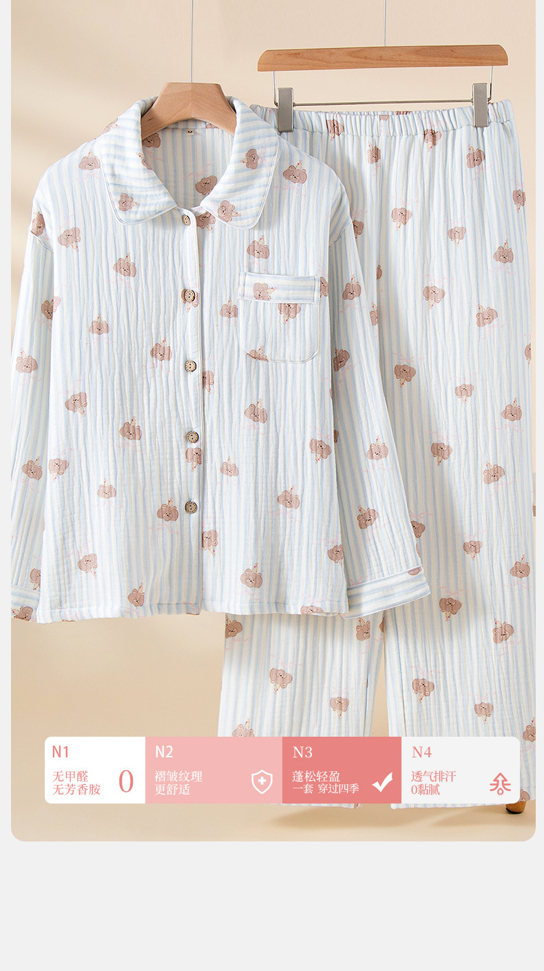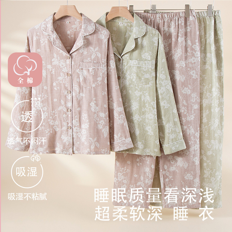 A类纯棉四层皱纱睡衣女春秋冬季鸢尾瓢虫翻领常规家居服套可外穿