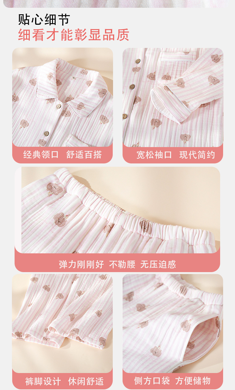 纯棉纱布四层加厚睡衣女春秋冬季新款条纹卡通刺绣长袖长裤家居服