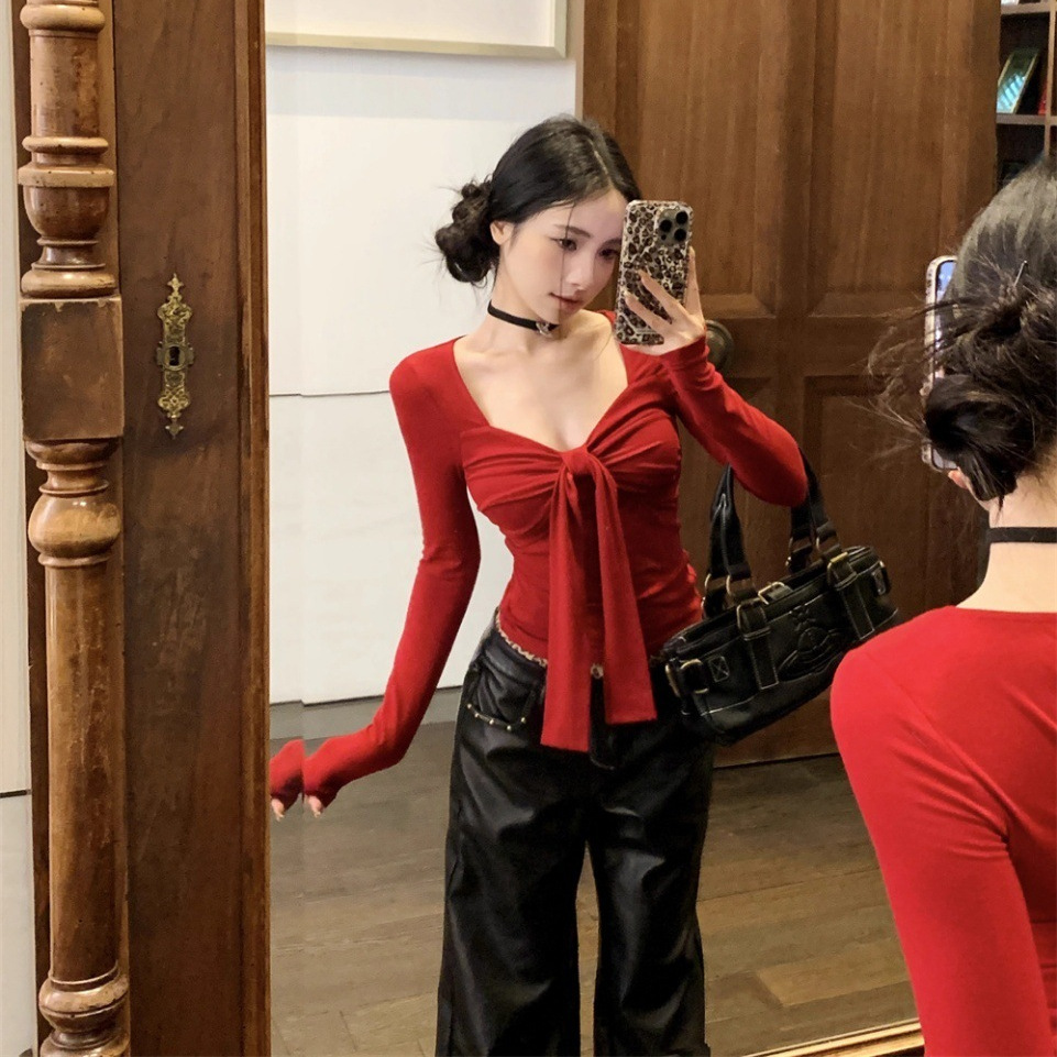 5186#早秋新款纯欲风蝴蝶结磨毛保暖长袖T恤显瘦女固定带胸垫百搭