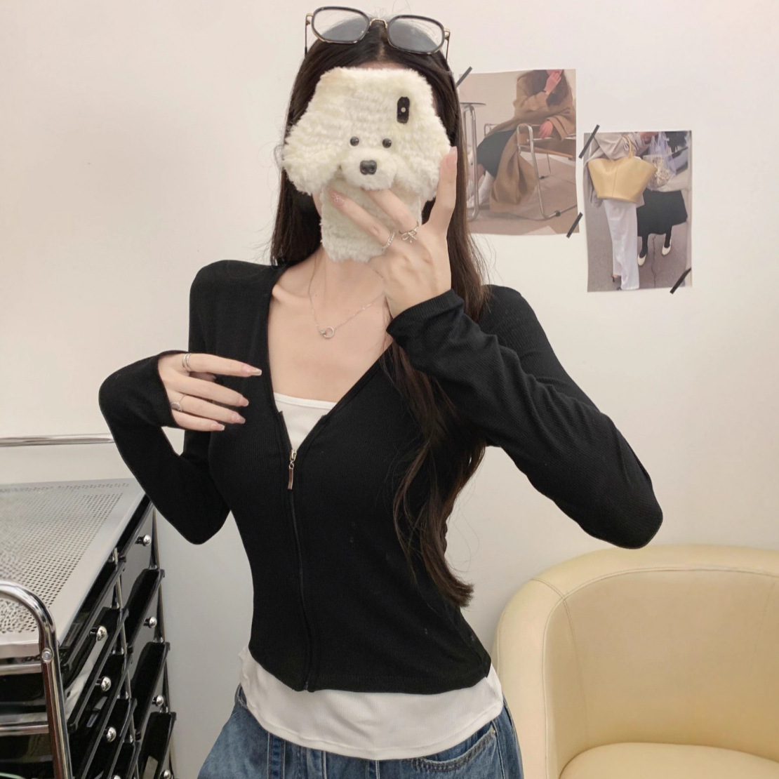 A121#初秋新款纯欲风假两件V领撞色拉链长袖T恤修身显瘦百搭上衣