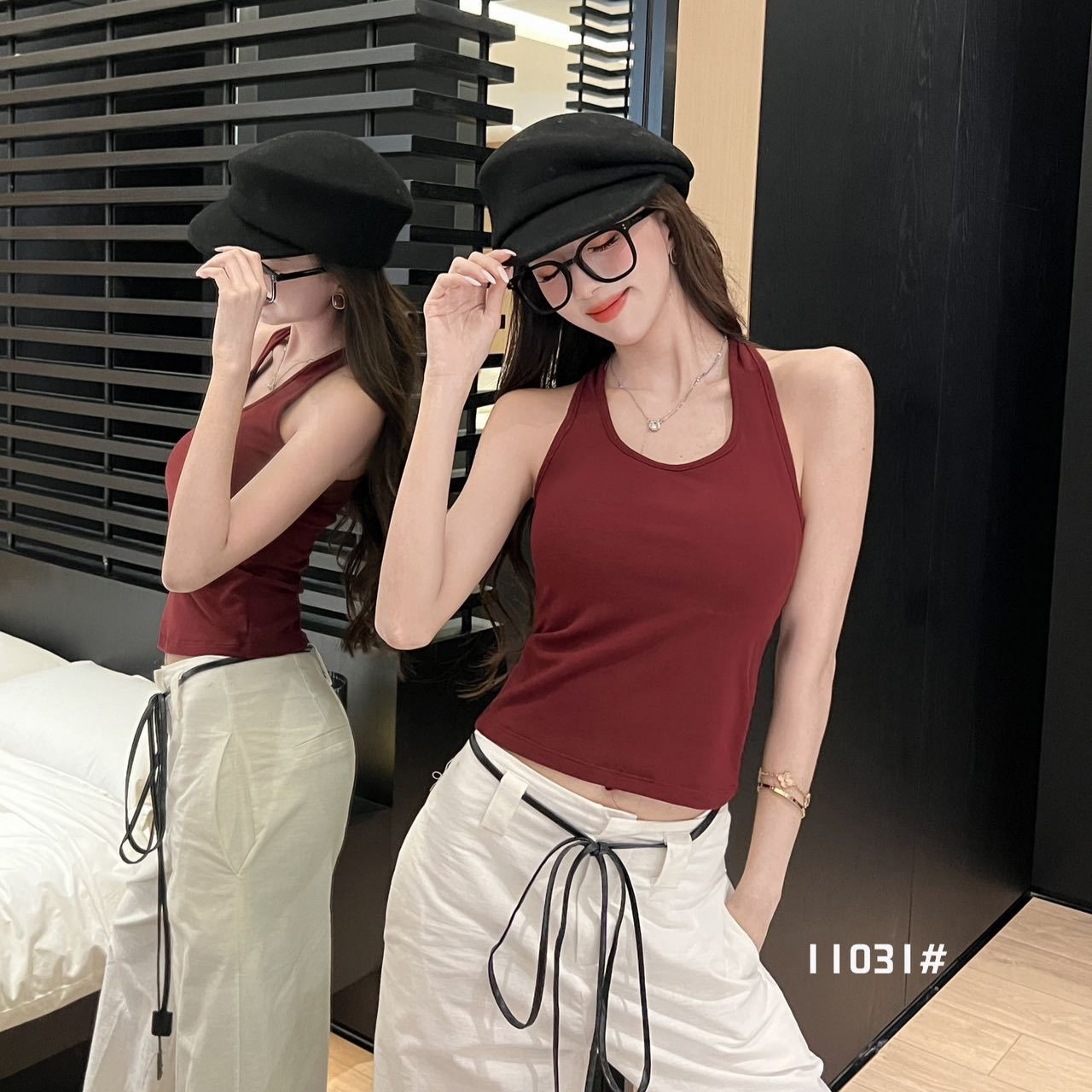 11031#初秋新款纯欲风磨毛挂脖工字背心修身显瘦女固定带胸垫百搭