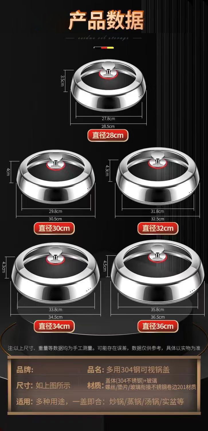 304不锈钢锅盖加厚耐高温钢化玻璃万能盖多用途厨房可视化防溢盖