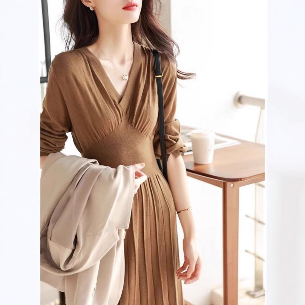 2025秋冬新作、エレガントなヘップバーン風Vネックニットワンピース、ウエストシェイプ、ロング丈、膝下丈、インナーにも使えるセーターワンピース